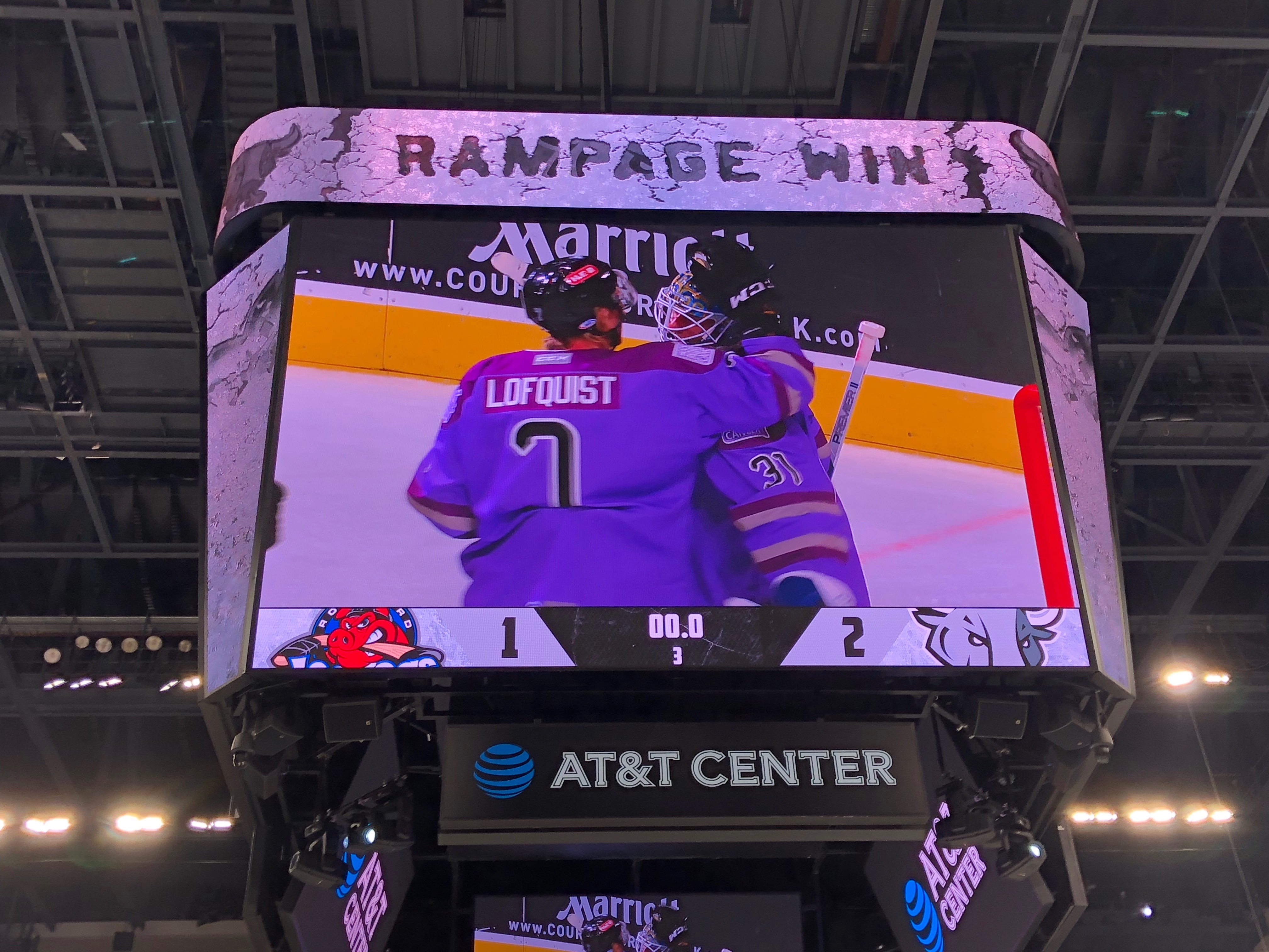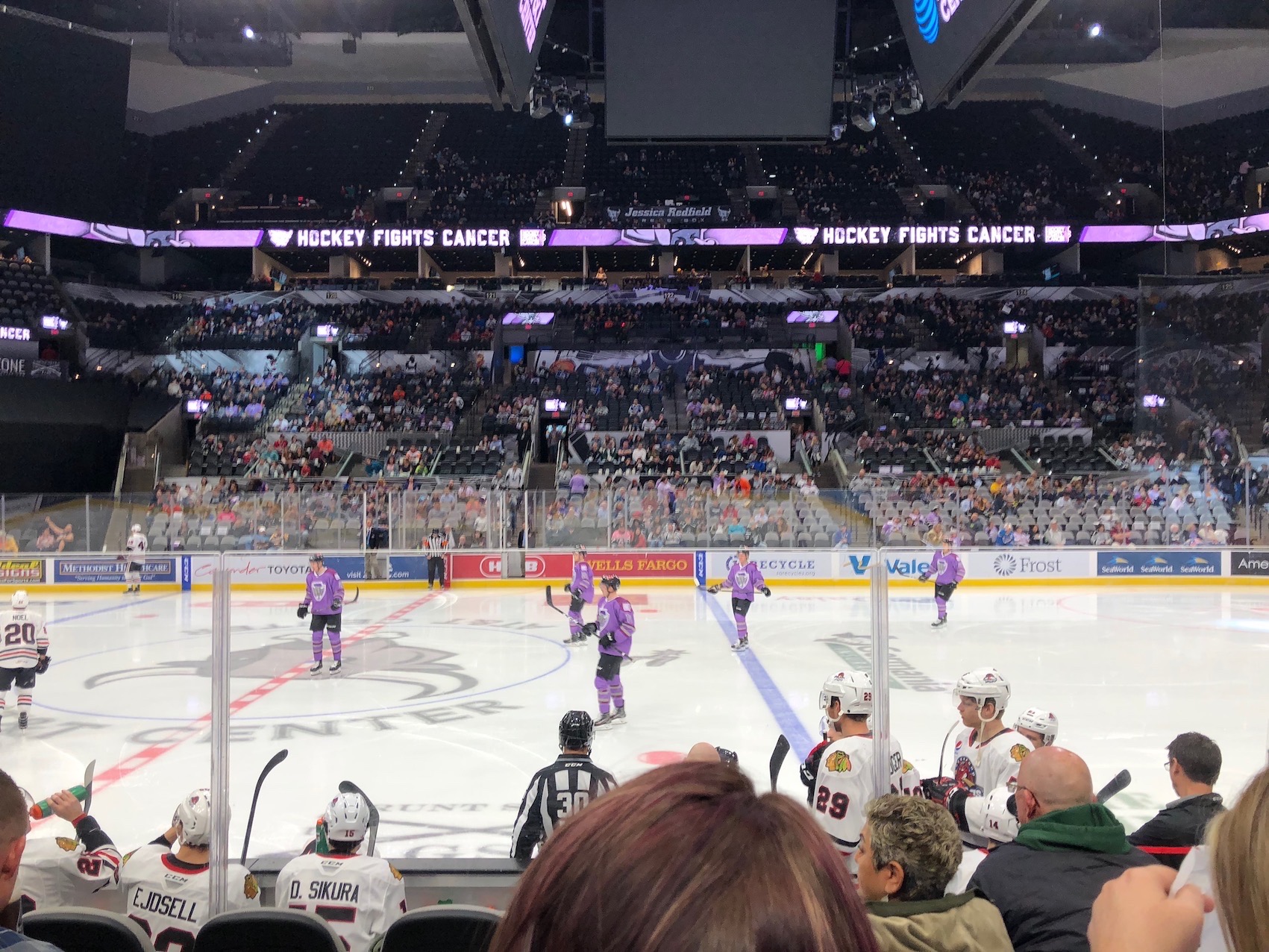 Prior to my recent trip to Texas I discovered that there was a game to watch whilst in San Antonio. The local club, San Antonio Rampage were playing the Rockford Ice Hogs in the American Hockey League. The AHL is a level below the top professional league, the NHL. This meant reasonably inexpensive tickets, one of which was procured for the game. The wrong game as it turned out, being the silly sod I am I had bought myself a ticket for Rampage Vs Ice Hogs on the following Tuesday. Much swapping of emails with Ticketbastard, sorry, Ticketmaster and I got it changed to the Saturday I was there and duly pitched up to the ticket office at the AT&T Center to collect it. After a bit of a discussion I was issued with a ticket for a completely different seat to the one I’d originally booked but hey, I was in the building so what the hell. The arena is huge, much bigger than I was expecting. I had no idea that San Antonio was as big as it is. So big in fact that it hosts a major league basketball club, the Spurs. Basketball is a big deal in the USA, much bigger than hockey. It dominated the sports channels on the TV and the Spurs have several NBA titles to their name. The AT&T Center has a capacity of 18,500 and will sell out for a Spurs game. The cheapest Spurs ticket is $139 plus fees for a seat in the gods. To get one next to the action you will pay $2300. Plus fees. To park your car in the endless parking lots will cost you an extra $20. Just as well, then, that I don’t like basketball. Tickets for the Rampage range from $14 to $57, parking was $8 and you get to see hockey, not basketball. It’s all a bit of a no brainer. My replacement ticket took me to a seat that wasn’t very good as it was in the front row. Some people like rinkside seats but this one was behind the player’s bench. I moved back a few rows to a vacant seat at the end of the first period. It still wasn’t great but at least I could see the hockey, not the back of the players’ heads.