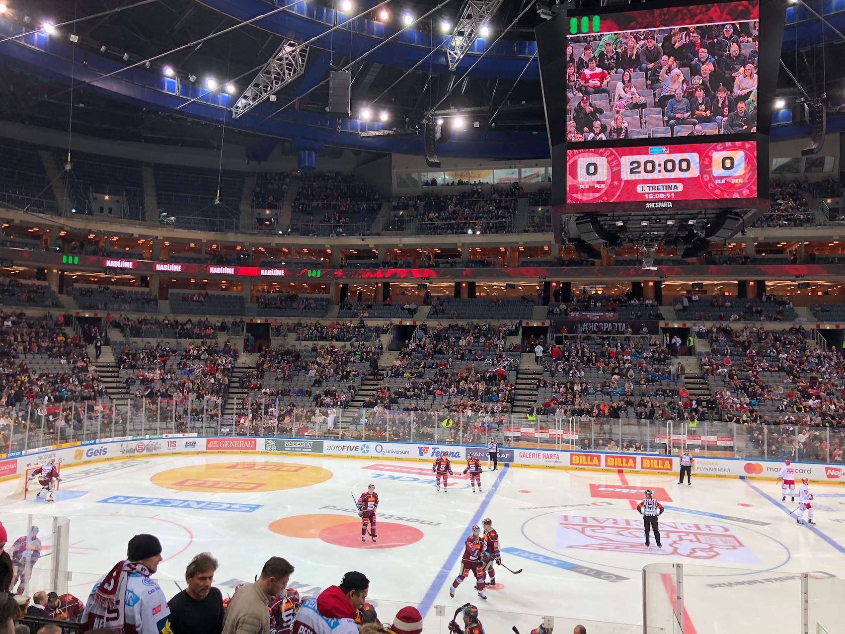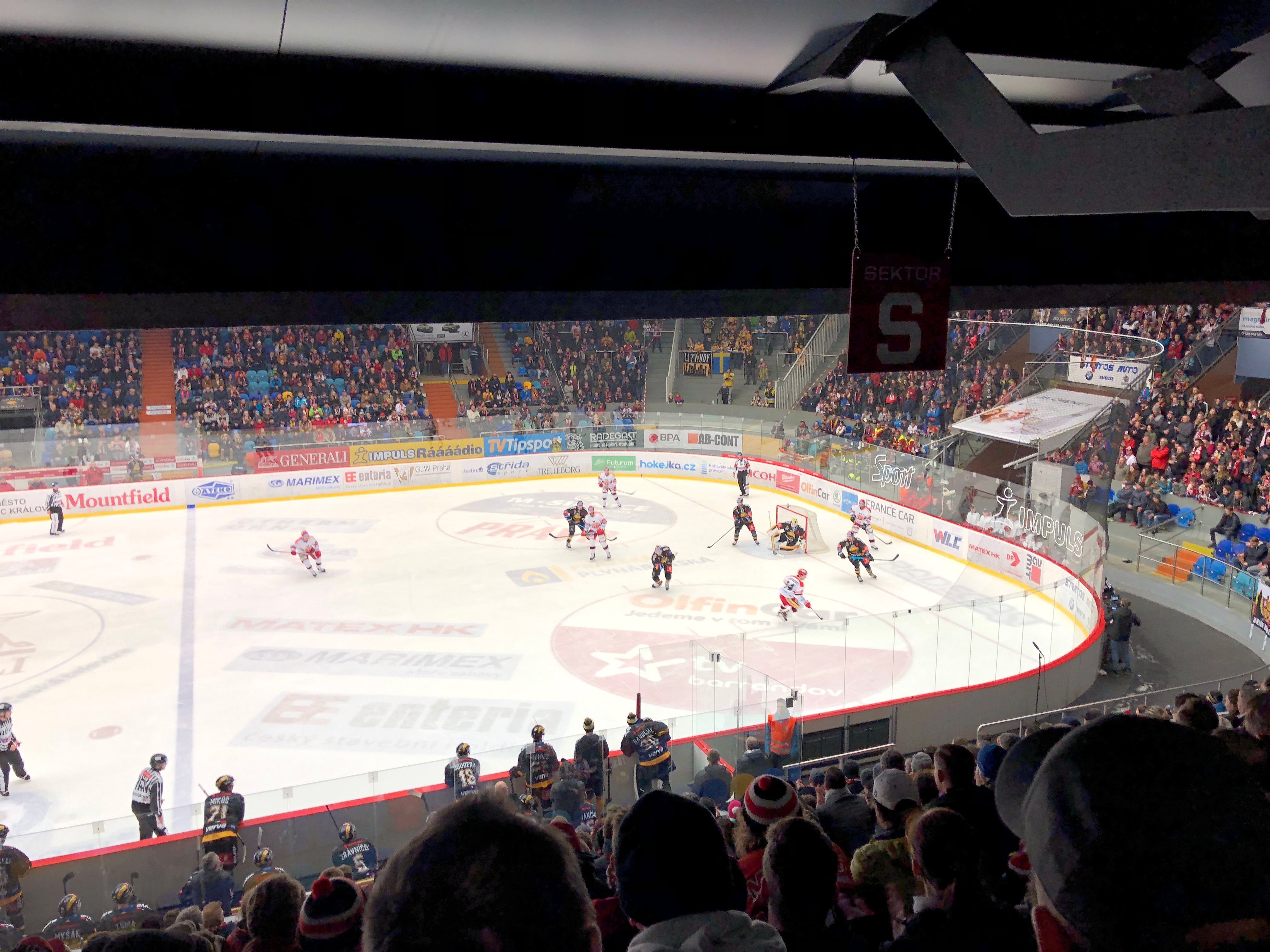 A week or so after the game in San Antonio I found myself in Czechia (this name was formally adopted in 2016 but is only slowly catching on). Accompanying me was a friend of mine, David. He was the chap who introduced me to hockey at Paisley all those years ago. We had decided to go and experience euro-hockey and felt a good place to start was this central European country which takes its hockey very seriously. It helped that it was a relatively cheap destination and easy to get to and so it was that we found ourselves in the town of Pardubice, about an hour east of Prague on the train. Once checked in to our hotel we hot footed it to the neighbouring town of Hradec Kralove to watch their local team, Mountfield HK (not the most Czech of names, it was something to do with a sponsor) take on Litvinov in the Czech Extraliga. This is the top level of hockey in the country and the standard is high. It was a little less physical than the hockey I’d seen in San Antonio or indeed at home but the skill level more than made up for it. The game was another close one with the home side prevailing once more, registering a 3-2 victory. The overall experience was rather different though. The CPP Arena in Hradec Kralove was built in 1957 and has a capacity of 7,700. Over 5,000 were there that evening and whilst most were sat in the seats that surround three sides of the rink, a good number were standing on the terrace at one end. Whilst this may seem a little archaic it was the place where the noisiest fans congregated. They barely stopped chanting throughout the entire game and the place was full of what can only be described as atmosphere. I’ve no idea what they were chanting of course though I thought I heard the words ‘Hradec Kralove’ a few times. ‘Mountfield’ never got an utterance. It seems civic pride outweighs love of the sponsor. Our seats, which cost about six pounds each, had a restricted view so we ended up standing too, though at the back of the seated section rather than the terrace. Mulled wine, beer and a large variety of sausages were available to purchase in the concourse for not many Crowns and it felt to me that this was exactly how professional hockey should happen. The fans celebrated goals and the victory as though the apocalypse had been averted. Real fans.