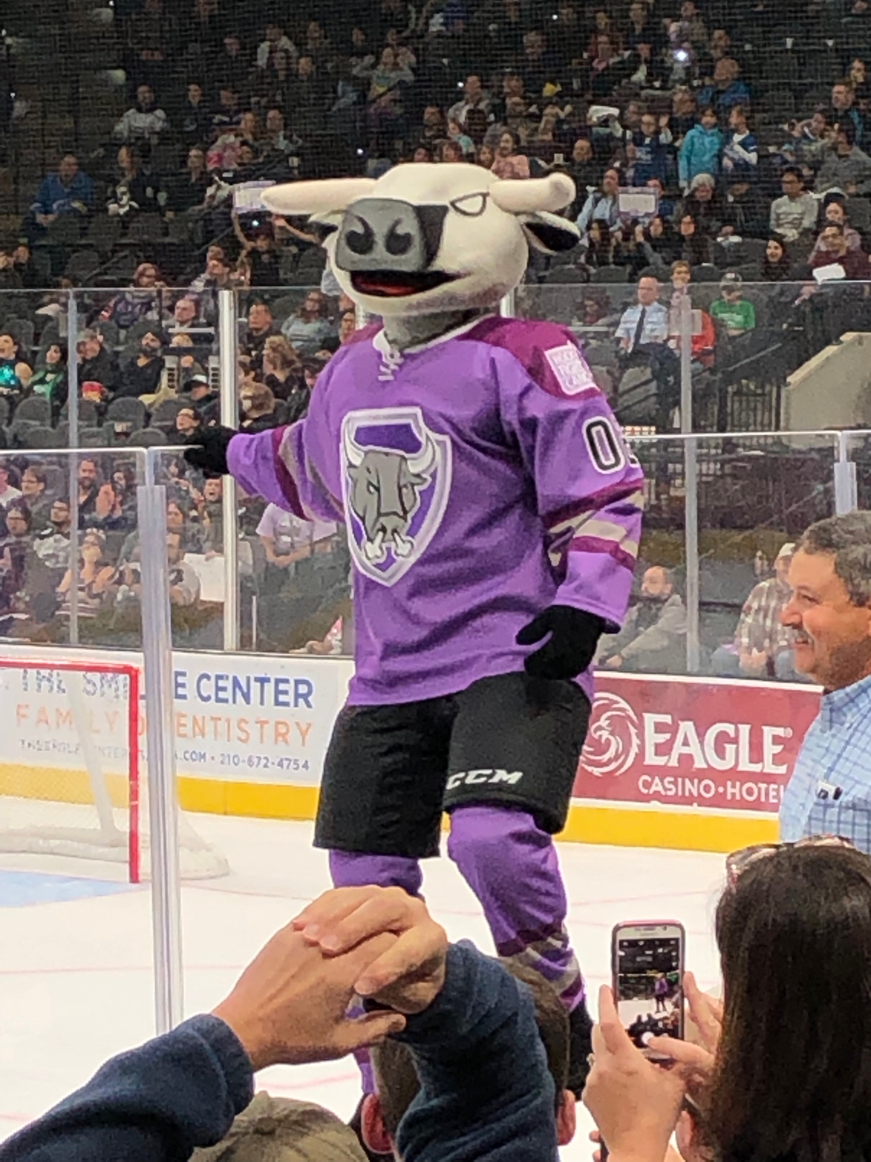 The hockey was of a good quality and the game a close one. The home team won 2-1, deservedly so, and most people went home happy. The crowd was announced as just over 8000 which is a pretty good turnout. I’ve been to NHL games with far fewer spectators. The game presentation was professionally done with the big scoreboard instructing people to make some noise, showing the occasional ‘kiss cam’ and also, as this was a ‘hockey fights cancer’ special, showing appropriate bits of video in support of the cause. Like Braehead/Glasgow, they have a bovine mascot though I must add here that ‘T-Bone’ is not a patch on ‘Clangus’. The atmosphere was a bit sterile though. When Clan score a goal I jump out if my seat, shout something akin to ‘yeahhhhhhh!!!!’ and generally wave my arms around like a deranged gibbon, as do most of the Clan support. When the Rampage scored it seemed to take a few seconds for it to sink in. A loud klaxon blared, a few fans got excited, the rest just smiled. I’ve found this before with sport in the USA. Unless it is at the business end of the season people treat a game as an evening out, not a religion. It takes nothing away from the game but just a little away from the overall experience. I’d enjoyed the game though and was glad I made the effort. I wish the Rampage well, especially as their coach, Drew Bannister was Clan’s player coach in the 2011-12 season.