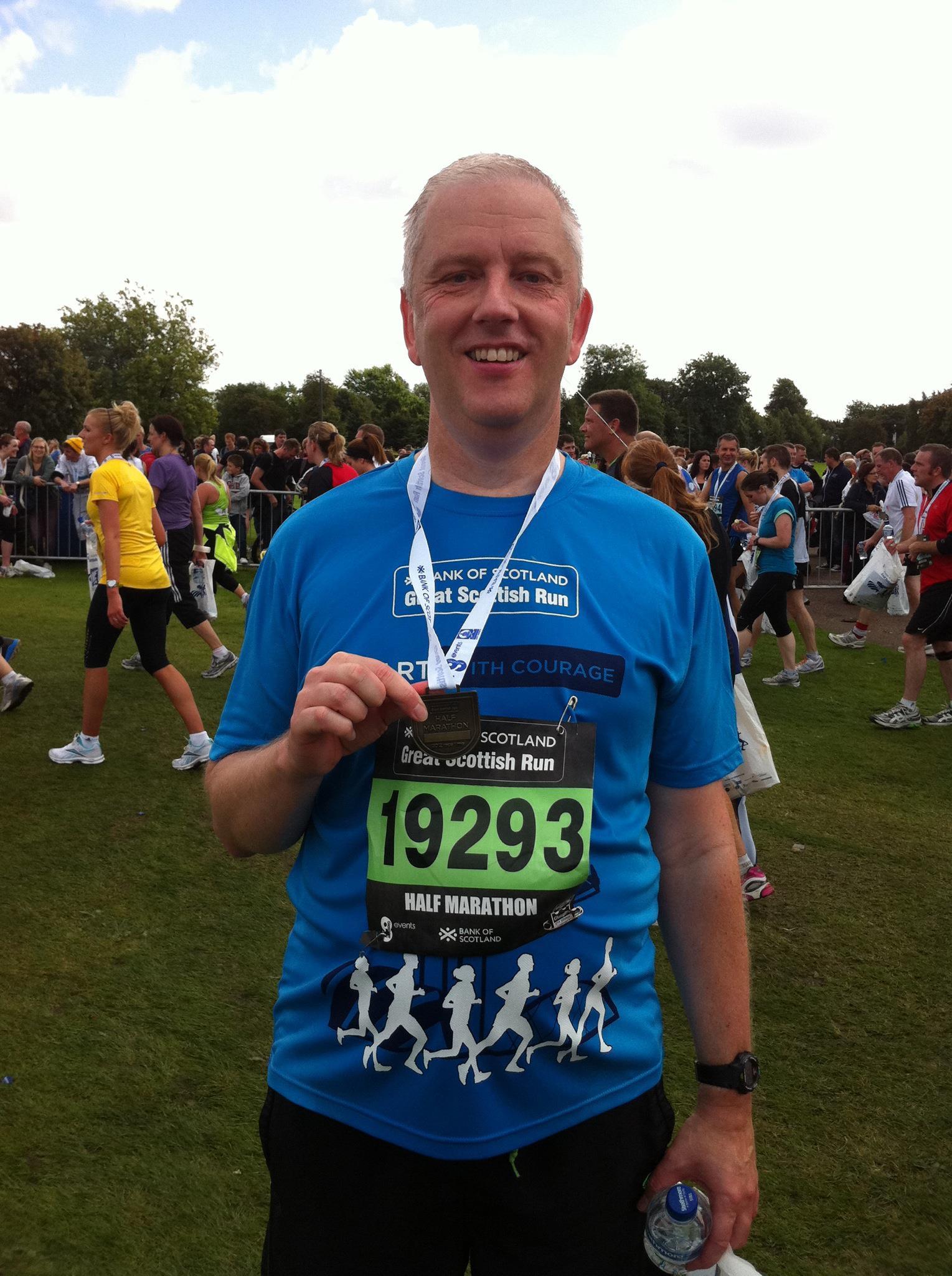 Every year in May Troon hosts a 10k run that is very well patronised. I decided to enter. I had about three months to build myself up from that one mile jog to six and a bit miles of running. That distance seemed huge but I got there and ran the race in a time I’ve failed to match in the subsequent two or three Troon 10k races I’ve competed in. I could hardly call myself a ‘good’ runner but I was happy with what I’d achieved in a short space of time. In a fit of optimism, probably misplaced, I entered the Edinburgh Half Marathon for the following year, 2011. It was a spring event but during the preceding winter as I tried to build up the distance I did my groin some mischief and had to pull out due injury. I did, however, grab a charity place in the Royal Parks Half Marathon in London the following October. Once recovered from the injury I built up the distances I was running and come the day, just nine days before my fiftieth birthday, I felt in good nick. I completed the race in 2 hours, 4 minutes and 7 seconds. This was much better than I’d expected. I do all my training runs solo and found that being in a race situation gives extra encouragement. I put it down to the fact there’s always a lady’s shapely Lycra clad bottom in front of me to try, usually unsuccessfully, and catch up with. Either way, I thank those unsuspecting pacemakers.