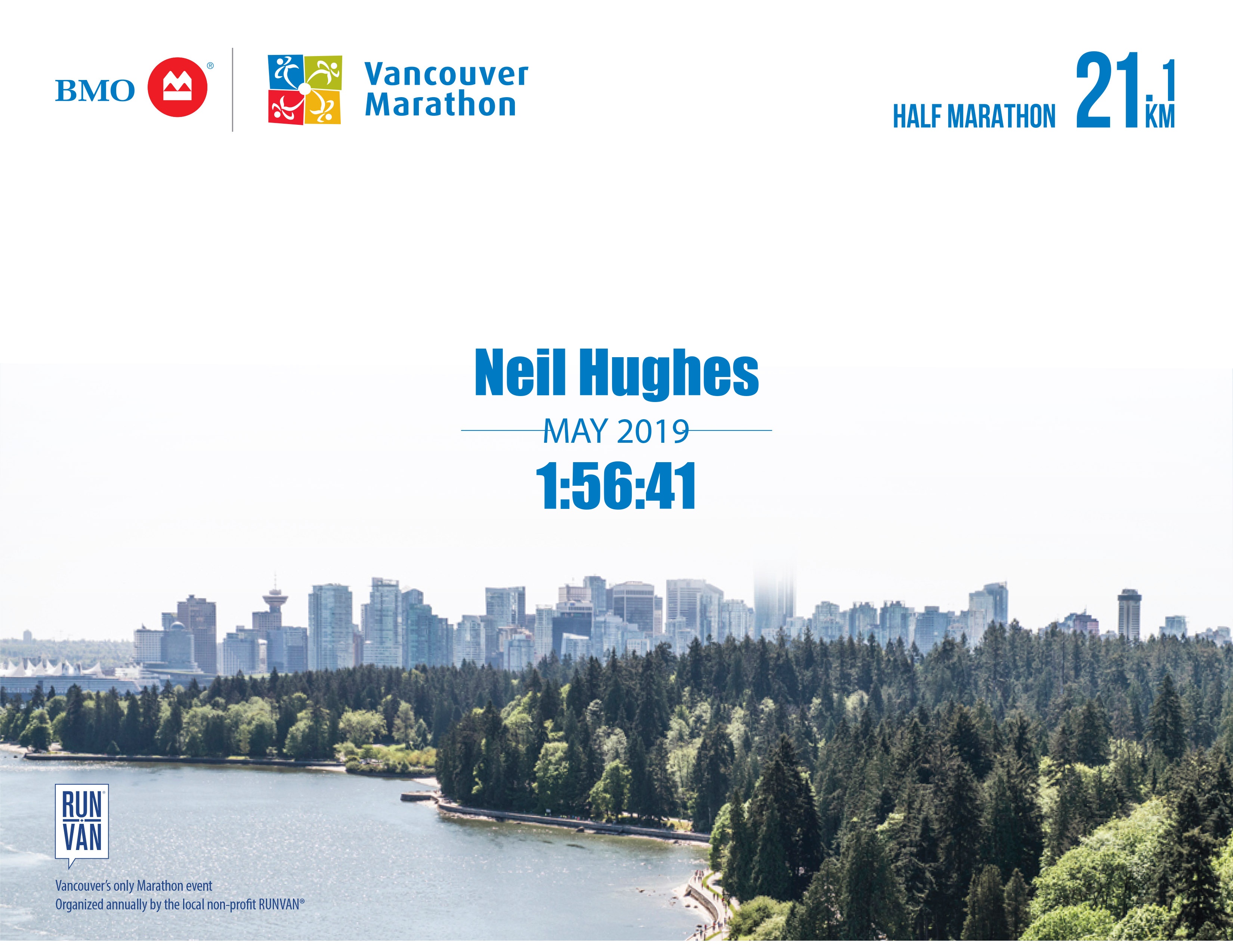 The half marathon course in Vancouver starts in Queen Elizabeth Park. After a minute you leave the park and head down Cambie Street towards downtown. This is a long, straight and above all downhill road. Running downhill can be a bit if a strain on the knees but the gradient was just right for a rapid start and having fought my way to the front of our coral I fairly flew the first three or four kilometres recording ‘lap’ times ten or twenty seconds less than I’d ever managed before. On crossing the bridge into the downtown area the course flattened out and all gravitational assistance ended. There was an up and down section in Chinatown, which of course could be any part of Vancouver but is the area north of that big stadium thingy. I nearly came to grief at the bottom of the down bit where the ground fell away a bit further than I’d anticipated but I managed to stay upright by swearing quite loudly. It doesn’t always work but I feel it helps. Continuing along Beach Ave and past English Bay we entered Stanley Park at the 12km marker. Here, a couple of other up and down sections awaited us, nothing too serious but a bit painful by then, as we snaked our way around the park. Eventually, the course emerged from the tree lined boulevards of Stanley Park where they had somehow crammed in 8 km which left 1 km (1.0975 km to be precise) to go. The finish was on the straight West Pender St in the middle of town and could be seen from 700 m away which I felt was a little cruel. My regular time checks had revealed that I was going a lot faster than I had anticipated by that point. Surely that couldn’t be right? It was hardly a sprint finish but I crossed the finish line and stopped the watch. I had beaten all the targets I had set myself including the fantasy two hour one. In fact I had smashed it by over three minutes. The official time was 1 hour 56 minutes 41 seconds.