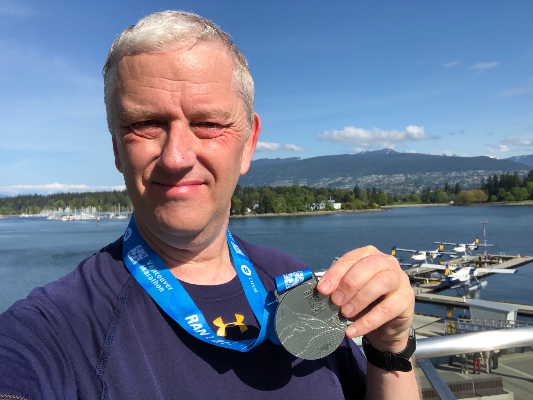 I had planned my celebration should I achieve a good time. It was to involve jumping up and down, waving my arms around and shouting exaltations with no little amount of profanity. What actually happened was I stopped running, checked my watch and thought thank goodness it’s over. It wasn’t an anti-climax, far from it, I was shocked yet delighted with time. I was just needed to collect the medal and other handouts, retrieve my goody bag and go somewhere reasonably quiet to reflect on what had just happened. And of course tell people via social media, I wasn’t going to keep it to myself for very long, this is 2019 after all. So it was that the tourists wandering round Coal Harbour by the cruise ship terminal and the seaplane base got to see me remove my sodden shirt and replace it with a dry one, then sit on the wall in the glorious sunshine (and slightly chilly breeze) informing the world via the miracle of the mobile interwebs what had just happened.
