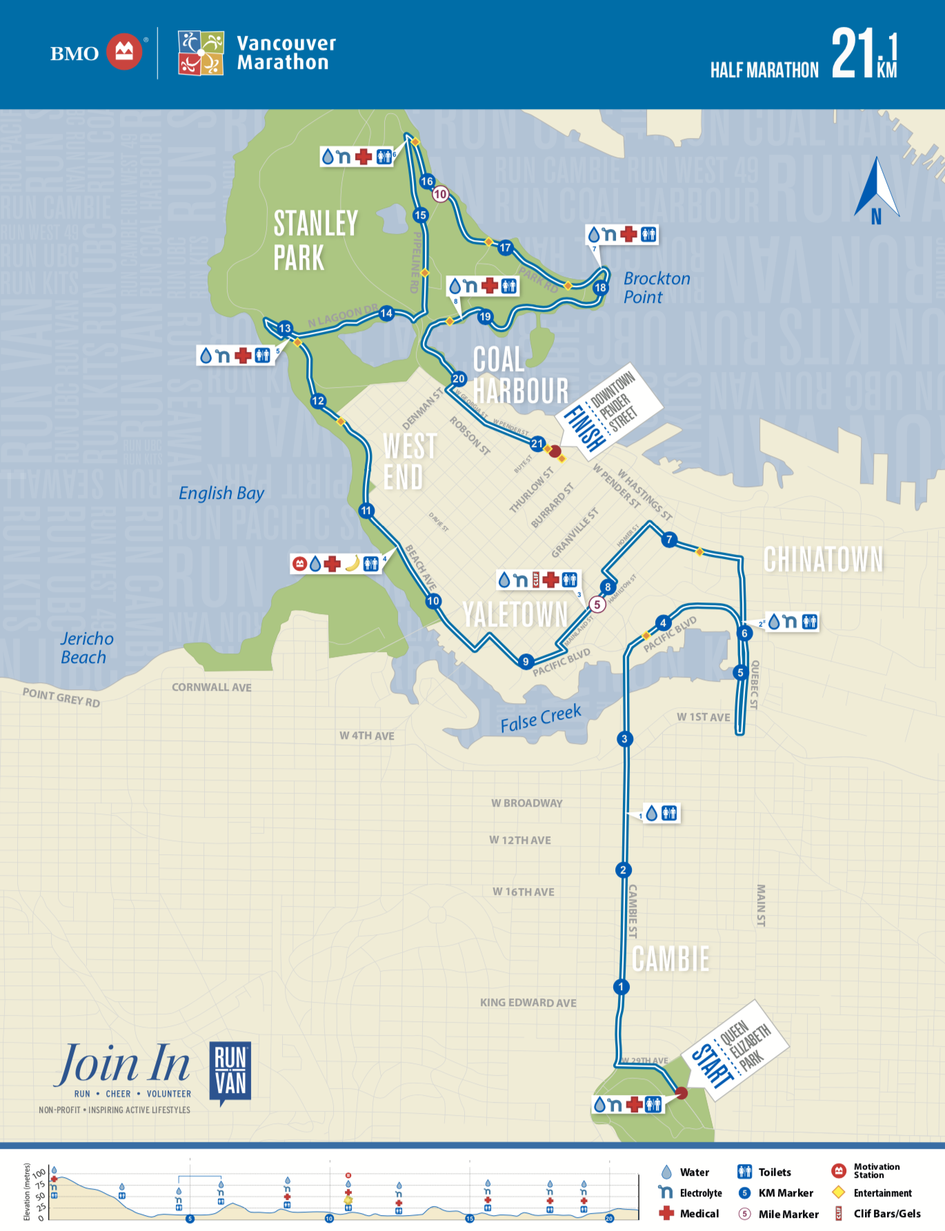 Since then, however, I’ve avoided races. Partially through injury – I did my ankle on holiday three years ago and couldn’t run for eight months – and partially through laziness. It was stupid as there is nothing quite like a race to encourage you to don the trainers and get out on the road. Well, in theory anyway. Last September Rebecca moved out to Victoria in Canada and promptly entered the Vancouver Marathon, to be run on May 5th this year. She had done her first full marathon in Paris a couple of years ago and this was to be her second. As a newly retired gentleman with some time in my hands I decided to go out to support her and promptly booked a flight. A few weeks later I had the idea that maybe I could do the marathon too. I quickly scotched that idea as I didn’t want to steal her thunder (that’s my excuse and I’m sticking to it) but I did feel I had the time to build up to the half marathon which took place on the same day. I filled out the online application form, paid quite a few Canadian Dollars and hey presto, I was a runner in my fourth half marathon.