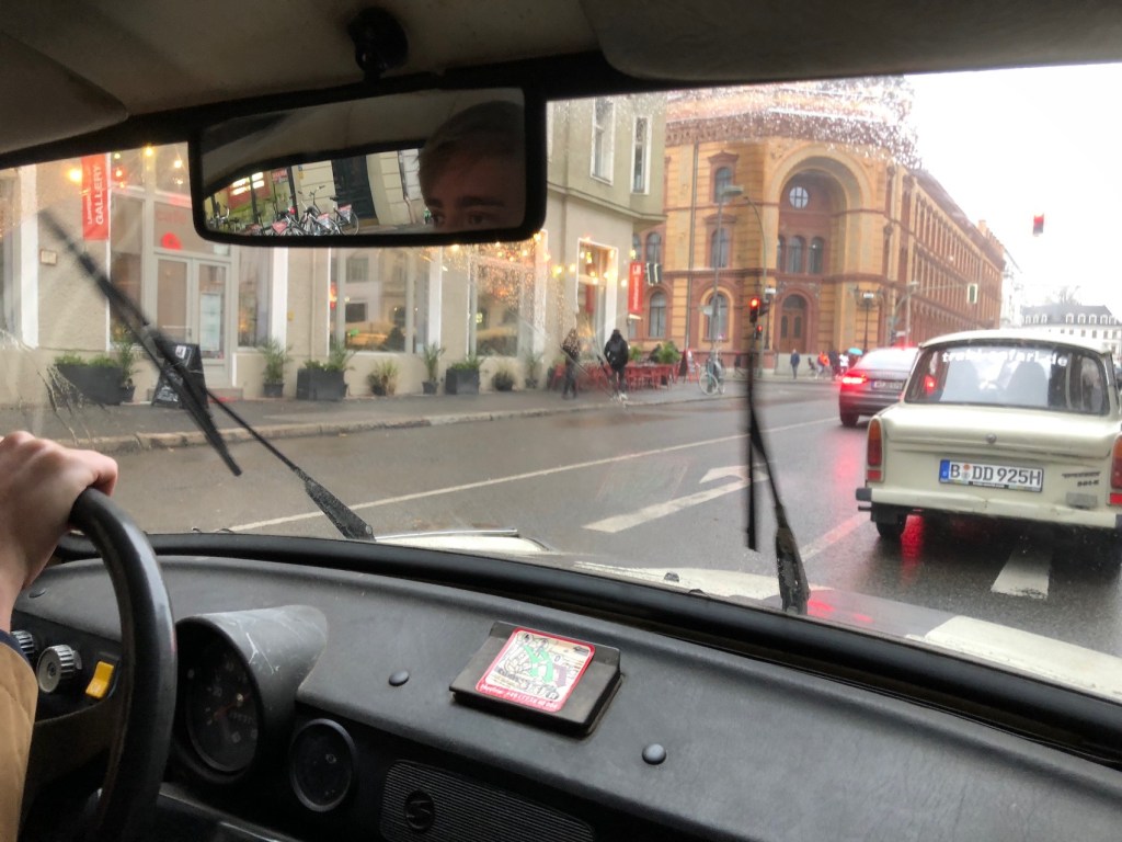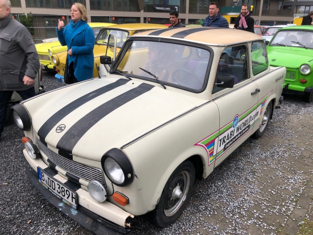 The size of the city became clearer the following day when we embarked on a Trabi Safari. Over three million Trabant cars were produced in East Germany from the mid-fifties to 1991 when production ceased with the unification of Germany. In that time the design scarcely changed meaning that whilst those in the West were driving around in state of the art Volkswagen and Mercedes Benz vehicles, those in the East were, if they were lucky, travelling in a small plastic 600cc two stroke engined car which was noisy and polluting. When the wall came down, these cars became something of a cult and thirty years on you can hire one to go on a tour of Berlin. The starting point is near Checkpoint Charlie and after a rudimentary induction into the car’s interesting foibles such as the steering column mounted gear shift, we were on our way in a convoy of seven. This was led by a tour leader who kept in contact via walkie-talkie. We must have driven through quite a bit of Berlin but in truth we spent much of the time concentrating on avoiding hitting cyclists who seem to believe they are immortal, ensuring the car didn’t stall, battling our way through heavy Berlin traffic (on the wrong side of the road of course) and generally feeling vulnerable in a car that is unlikely to score highly in a latter-day safety test. It was great fun though, despite the offset foot pedals, very heavy steering and a foot break that only worked if you applied all your strength through your right leg. I don’t believe I have ever been photographed as much either. Every time we stopped at the lights, which was often, we were enthusiastically snapped by tourist who were delighted to see these machines still tootling round Berlin. That evening we joined in the 30th anniversary celebrations of the wall coming down. We didn’t stay long as it involved a lot of speeches and neither of us are exactly fluent in German but it was nice to be there for such a significant anniversary.