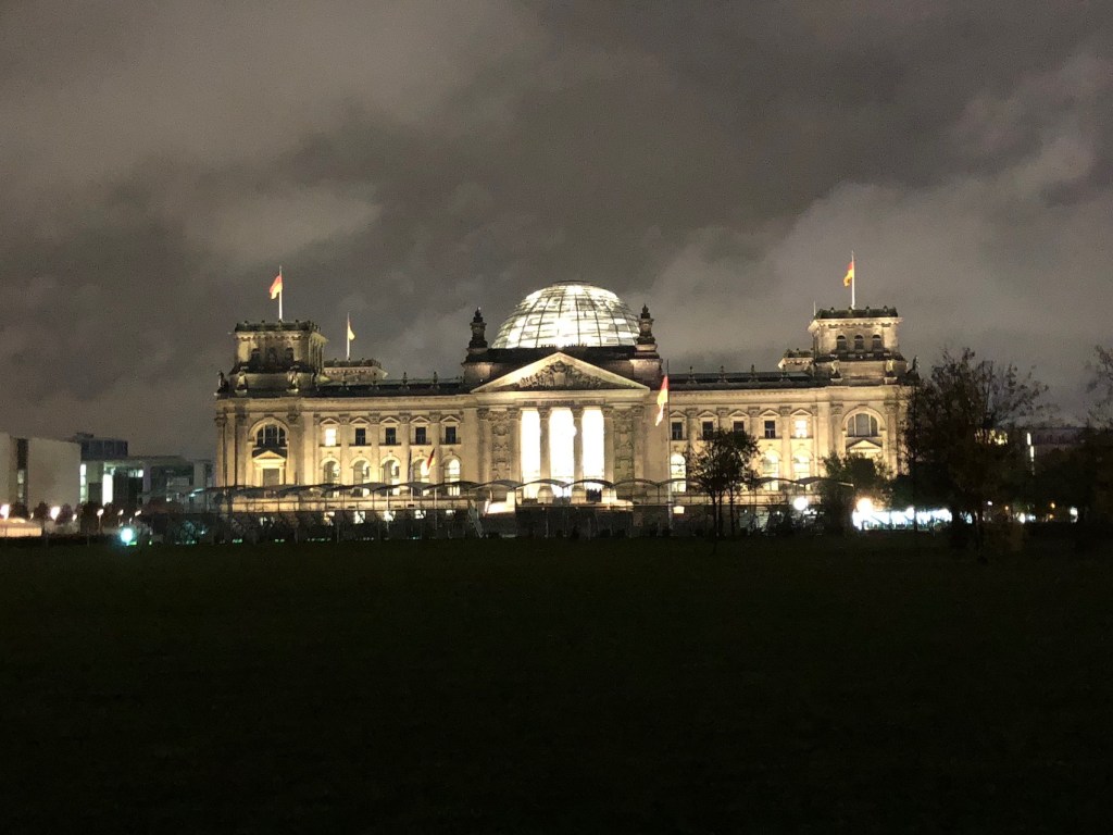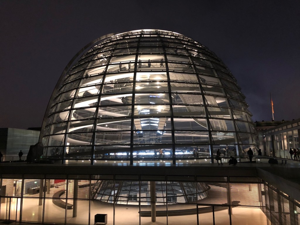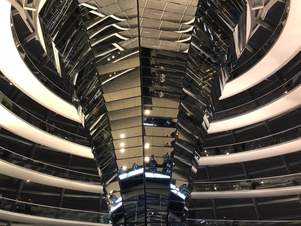 In the evening we visited the Reichstag Dome. Germany’s parliament moved back to Berlin following the reunification of Germany in 1991. Later that decade, the old Reichstag (parliament building) was completely renovated. The architect was British, Sir Norman Foster. Foster retained the towers on each corner and the traditional frontage of the building but had a blank canvass for the rest. On the top of the building he placed a glass dome with 360 degree views to represent the reunification of Germany. You can request to visit the dome. It is a popular thing to do so worth planning ahead for and is free. We could only get a timed slot on the Sunday evening. It is most certainly worth it though. From a distance the dome might seem out of place on what from the outside looks like an old building. Up close and inside, however, it looks magnificent. An audio guide explains things as you wander up one of the spiral ramps to the top. Due to the dark and misty conditions it was difficult to identify the buildings that were being pointed out but that didn’t really matter. The dome itself was impressive enough. An array of mirrors hangs from the centre reflecting so much light down on to the Bundestag below that a large shade, which follows the sun, had to be installed to prevent Germany’s politicians from being blinded. You’ve got to jump through a security hoop or two to get there but it was more than worth it.