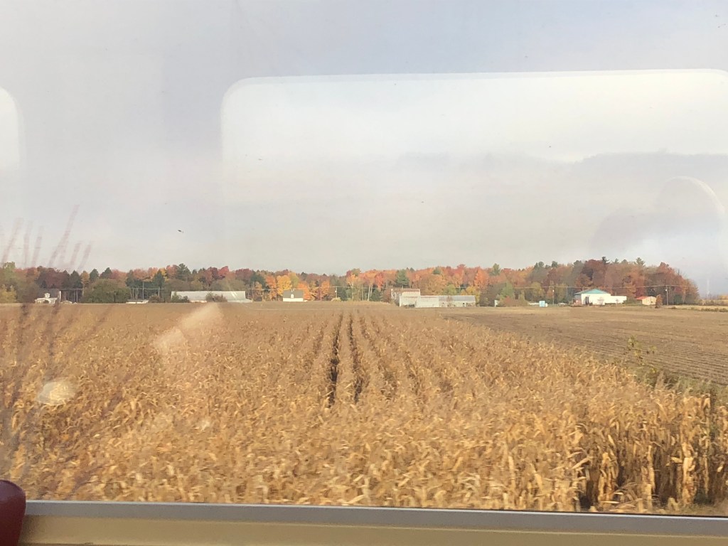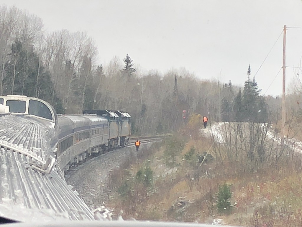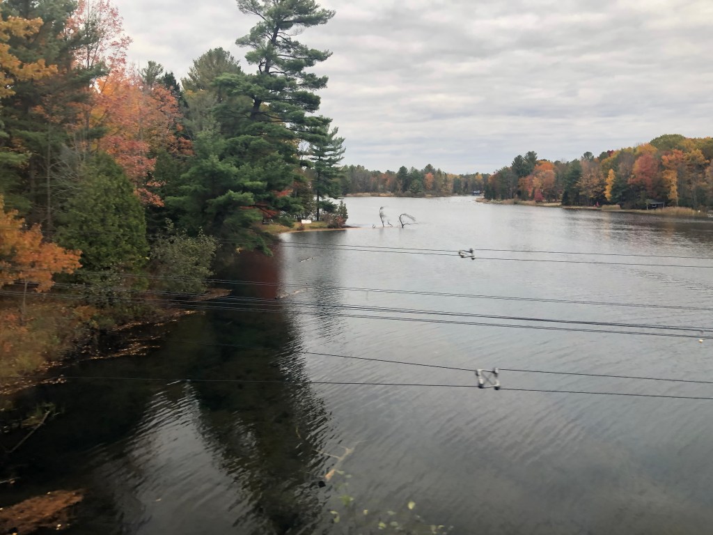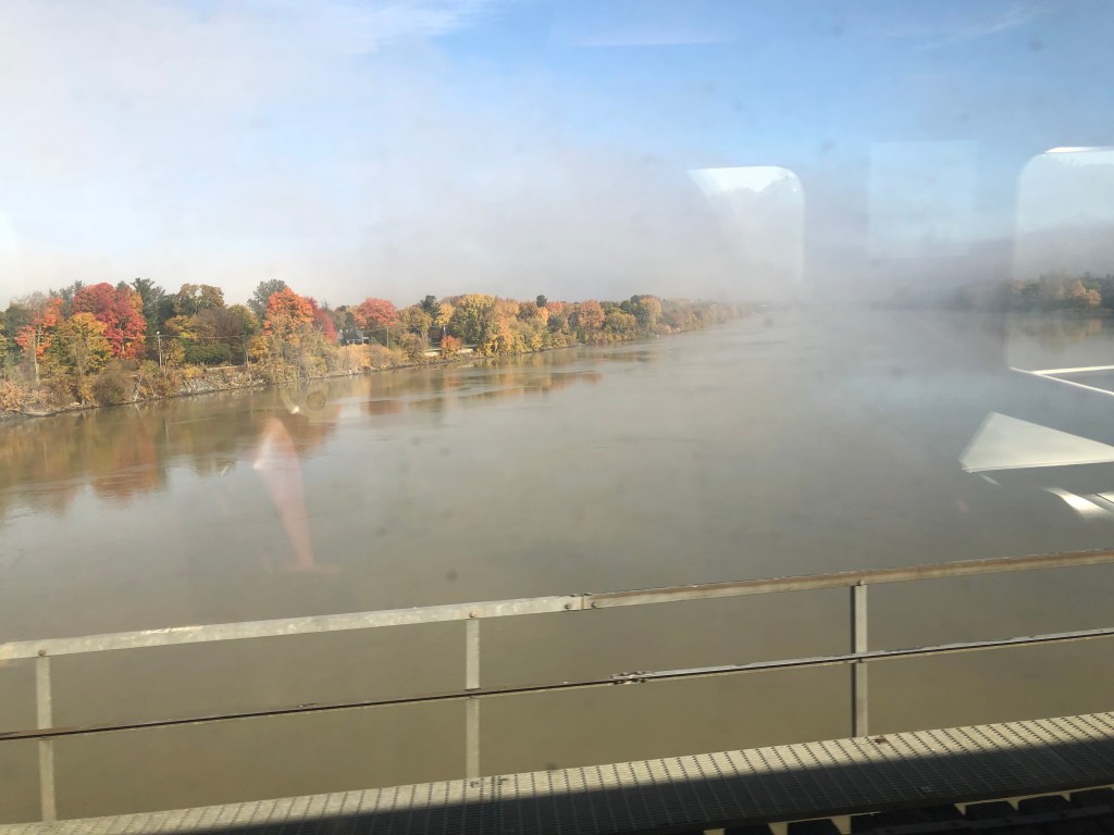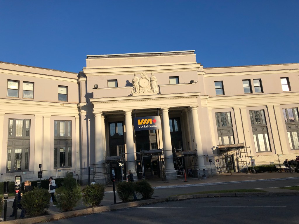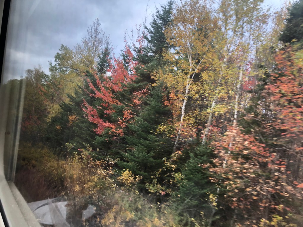 The train pulled out of Halifax bang on time. Whilst the cabin was comfortable I soon left it and made my way to the Lounge Car. Whilst this sounds a lot grander than it actually was, it was light and airy and you could see out of both sides of the train. It also had WiFi which I was surprised about. This, however, depended on the local cellphone coverage and as Canada is big – I might have mentioned this in previous blogs – it was a bit hit and miss as to whether there was any service. I had chosen second sitting for lunch and was called through to the restaurant car at 2:45pm by which time I was rather peckish. Sleeper passengers have meals included in their fare. A soup, chowder in this case – was followed by a choice of main courses. I had chicken schnitzel salad and followed it up with a quite a large slab of carrot cake. It was rather filling for a lunch and I can safely say I wasn’t peckish once I’d finished it. Lunch done, I continued to watch Canada roll by. Whilst I had not booked this journey in October to specifically view the autumnal colours, I was delighted to see the full spectrum of red and gold foliage passing by, sometimes tantalisingly close to the window. There were a number of stops at places like Truro, Amherst and Moncton. There were also numerous ‘flag’ stops at smaller settlements. These appear in the timetable even though we passed most without stopping. Eventually the sun set and the second sitting for dinner was called. Soup or salad for starter, a choice of three mains – butter chicken for me – and pecan pie for dessert. Soft drinks were free with meals or you could pay for an alcoholic one so it was a beer for me which I could have had for free as we were out of range of data and the card machine wasn’t working. I paid the following morning. I’m too honest for my own good sometimes.