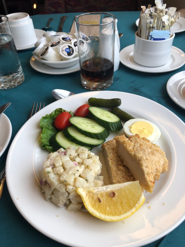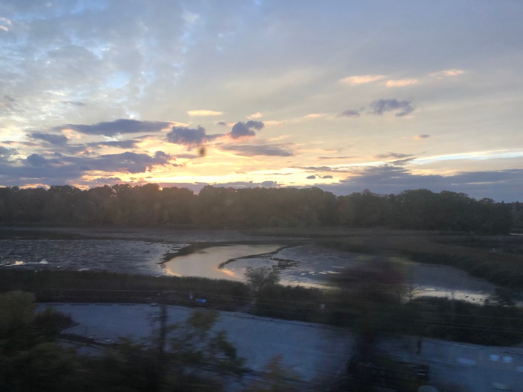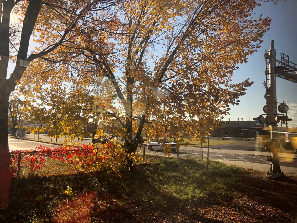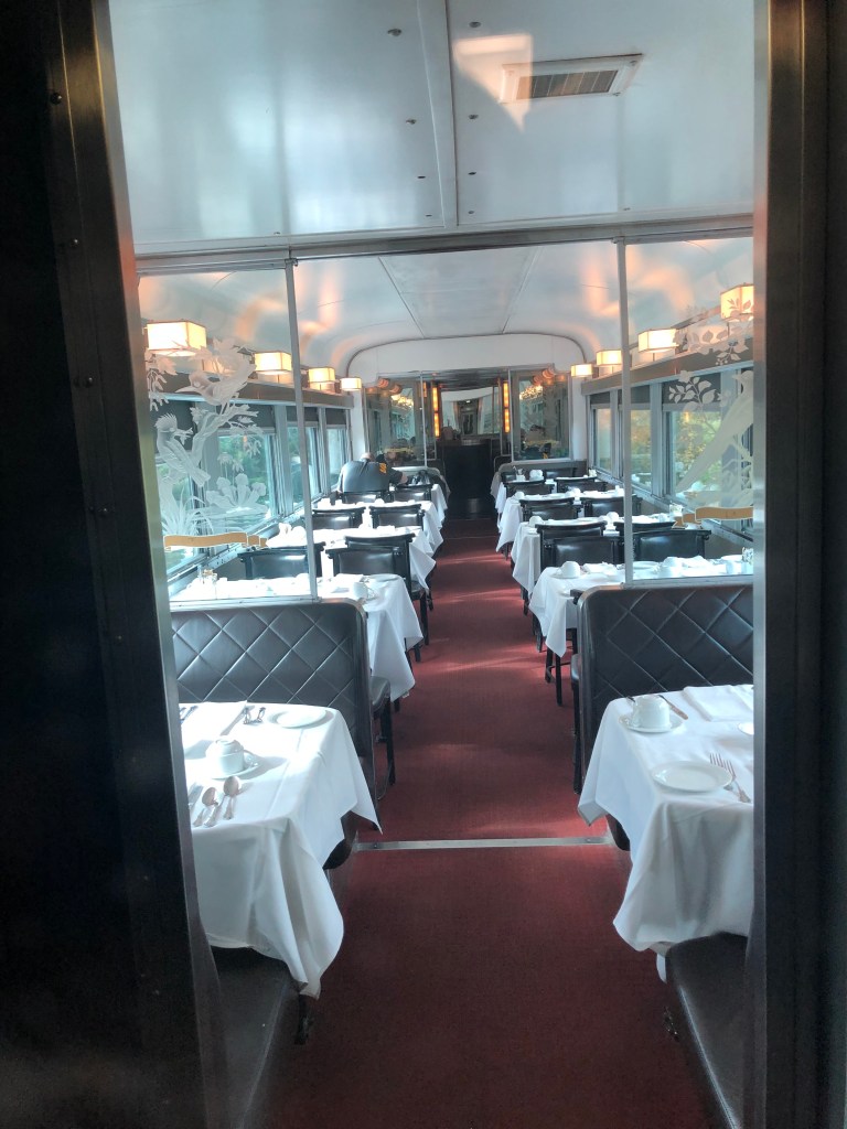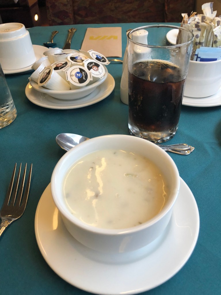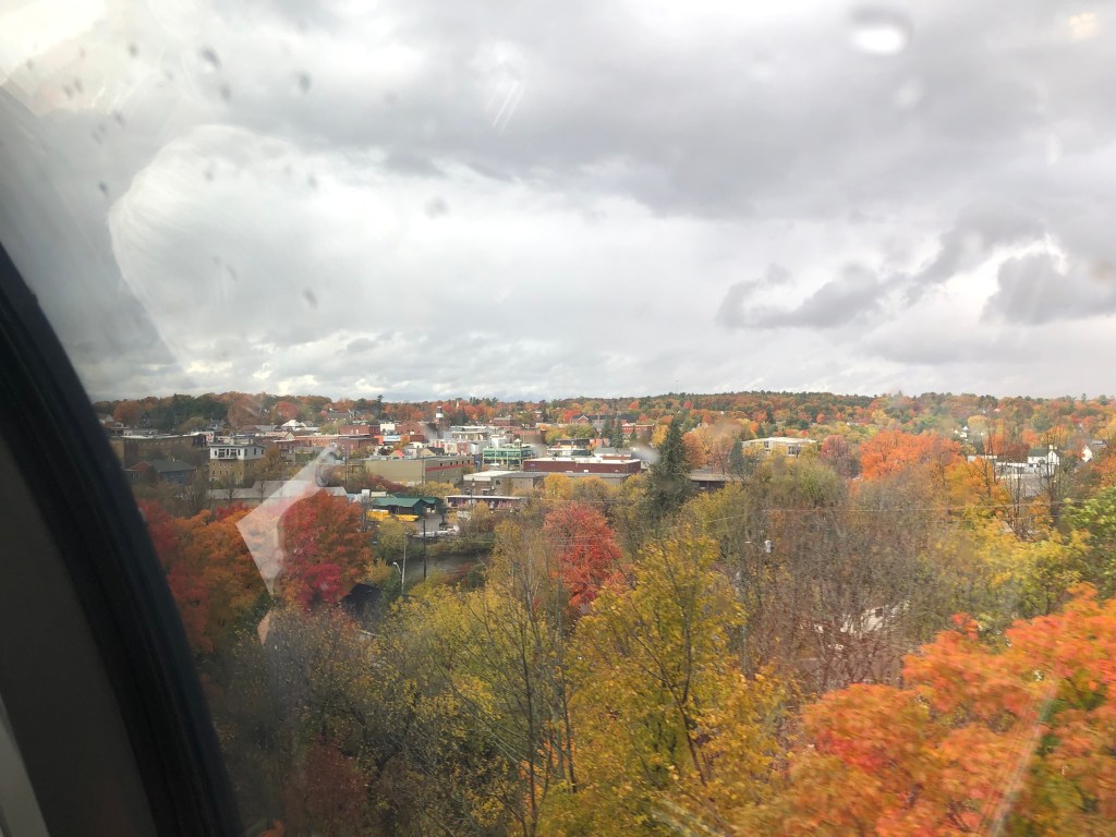 The train pulled out of Halifax bang on time. Whilst the cabin was comfortable I soon left it and made my way to the Lounge Car. Whilst this sounds a lot grander than it actually was, it was light and airy and you could see out of both sides of the train. It also had WiFi which I was surprised about. This, however, depended on the local cellphone coverage and as Canada is big – I might have mentioned this in previous blogs – it was a bit hit and miss as to whether there was any service. I had chosen second sitting for lunch and was called through to the restaurant car at 2:45pm by which time I was rather peckish. Sleeper passengers have meals included in their fare. A soup, chowder in this case – was followed by a choice of main courses. I had chicken schnitzel salad and followed it up with a quite a large slab of carrot cake. It was rather filling for a lunch and I can safely say I wasn’t peckish once I’d finished it. Lunch done, I continued to watch Canada roll by. Whilst I had not booked this journey in October to specifically view the autumnal colours, I was delighted to see the full spectrum of red and gold foliage passing by, sometimes tantalisingly close to the window. There were a number of stops at places like Truro, Amherst and Moncton. There were also numerous ‘flag’ stops at smaller settlements. These appear in the timetable even though we passed most without stopping. Eventually the sun set and the second sitting for dinner was called. Soup or salad for starter, a choice of three mains – butter chicken for me – and pecan pie for dessert. Soft drinks were free with meals or you could pay for an alcoholic one so it was a beer for me which I could have had for free as we were out of range of data and the card machine wasn’t working. I paid the following morning. I’m too honest for my own good sometimes.