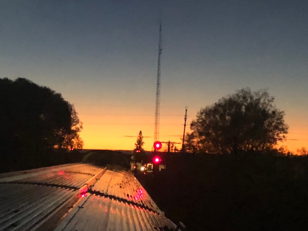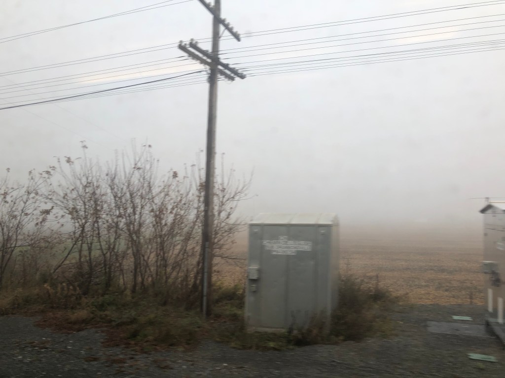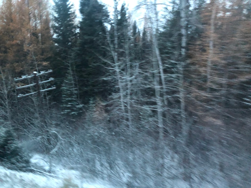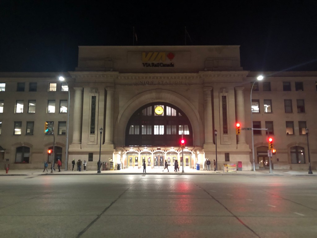 (Hornepayne was a technical stop in the middle of the night. I wasn’t tempted to step out and discover if it had anything to offer.) I had a terrible night. Whilst the bed was comfy enough and the bedding very nice, it could do nothing to stop all the rattling and racket of the train. My cabin was right over one of the car’s bogies and I felt every rough bit of track and there was plenty of that. To cap it all we had moved into another time zone so there was an extra hour in bed to endure. I needed to get out of bed and wander down the corridor to the toilet a couple of times (still better than trying to use the one in the room) and peeking out of the window the ground appeared to have taken on a white hue. Eventually nighttime became daytime and it became obvious that snow was covering the ground. Not much, but enough to turn an autumn Canadian Shield into a winter one. I pulled on some clothes and headed for breakfast. It’s first come, first served and I was stuck on a wait list. I went up into the dome, where ice on the window was spoiling the forward views, and waited. For quite a long time as it happens. I had either been forgotten about or not heard my name being called. So it was a late breakfast and last dibs for the day’s meal sittings which were being allocated by the waiting staff. It was to be first sitting or nothing which meant lunch would be only two hours after breakfast. It was an inauspicious start to my second day on The Canadian. However, things soon picked up. Each sleeping car has its own shower and it was pretty good. Refreshed, I headed back to the dome to watch a wintery looking Canadian Shield go by. It was really quite spectacular. Sure enough lunch came all too soon and in the early afternoon we came to a standstill in the only town for miles around, Sioux Lookout. It was time for a stretch of the legs again. The temperature was a chilly -4C with some light snowfall. Despite this, I wasn’t going to miss an opportunity to walk, even if it was only up and down the side of the train. With the new engineers arriving late, our stay there was a bit longer than anticipated but the bonus was the town has 4G and I was able to check in with home before we re-entered the data desert. Once they had turned up, the engineers moved us out of Sioux Lookout and it was more hours of the Canadian Shield, the snow eventually running out and returning the Shield to autumn once more. In the evening we finally managed to escape the surprisingly huge province of Ontario and enter Manitoba but the Shield hadn’t finished. As I watched the sun set over the front of the train, I actually felt very much at peace with a world that was gently rolling past me, increasingly unseen. We rolled into Winnipeg at about 9pm. The stop there was a couple of hours so I got off and went for a wander. Although the station is in the city, there wasn’t much to see at that time of the evening. It was -2C too so I spent most of the time in the station building which was quite impressive. Soon though it was back on board to see if I’d have a better night’s sleep.