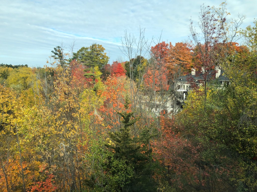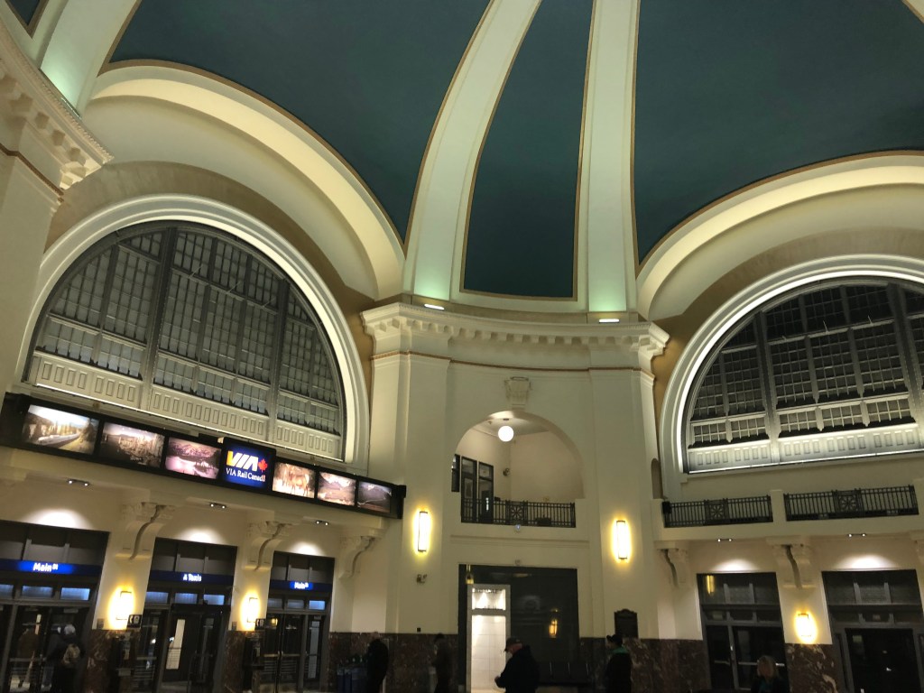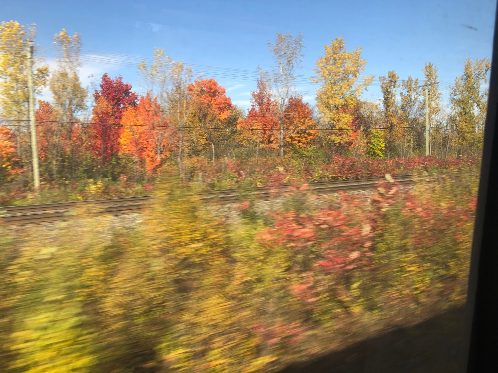 I had a couple of hours to kill before the 1:23pm train to Toronto. It was a nice day so I had a bit of a wander round Montreal, at least the bit of the city near the station. I got to see Notre Dame which, unlike its namesake in Paris, appears to not be fire damaged. However, the train was calling so I headed back to the station and awaited train number 67. Whilst this specific service does not have a name, all trains that run between Quebec City in the north to Windsor Ontario in the south are called Corridor trains. Trains linking Montreal and Toronto make up the bulk of these services with five or six of them a day connecting Canada’s two largest cities. The one I was on was scheduled to take five hours ten minutes. The train itself was much the same as trains in the UK and Europe. 2-2 seating in economy/second class, a trolly service for drinks and snacks and a couple of business/first class cars at one end of the train. It was busy too with most seats in my car taken. I was happy to see my checked bag had been transferred from The Ocean directly to one of the luggage stacks in my car. We pulled out of Montreal on time and headed southeasat. A brief stop at Dorval, for Montreal Airport, turned into rather longer one than anticipated but once we got a green signal we were soon rattling along at an impressive 95mph. Both Quebec and then Ontario continued to deliver on the autumn colours for much of the journey. We followed the St Lawrence and then the western shore of Lake Ontario but only saw them fleetingly as the train tried, and failed, to make up for the time lost at Dorval. It was a comfortable enough journey. The train itself was unremarkable though there appeared to be quite a few on board for whom train travel was a novelty. We pulled into Toronto’s Union Station fifteen minutes late which was a bit of a shame as I had a hockey game to go to and it was due to start at 7pm. I grabbed my bags and set off for my accommodation for the night. It was close to the station, as was the arena but unfortunately they were in opposite directions. A quick check-in and a dumping of the bags later, I hot-footed it to the Scotiabank Arena to see the Toronto Maple Leafs play the Ottawa Senators. I was sweating profusely by the time I made it to my seat which was way up in the gods. I only missed five minutes of action so I consider it a result. Speaking of results, the Maple Leafs won, 3-2.