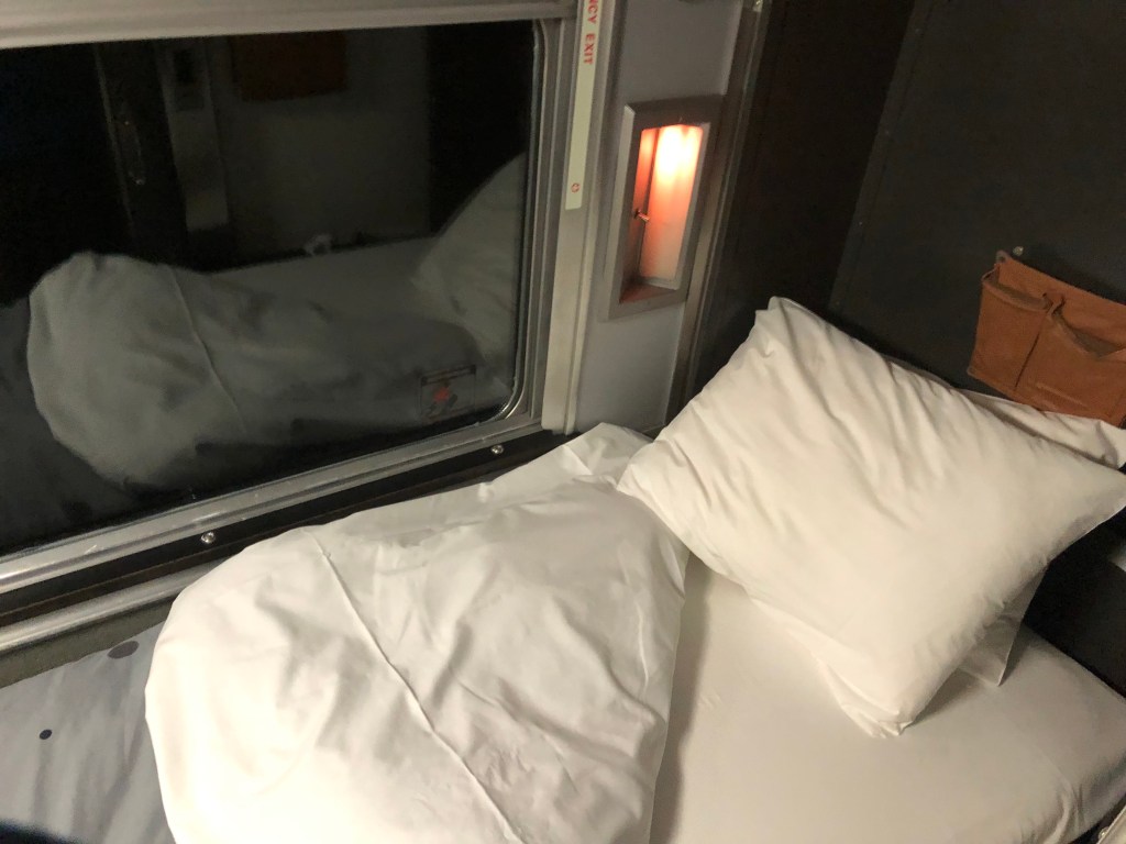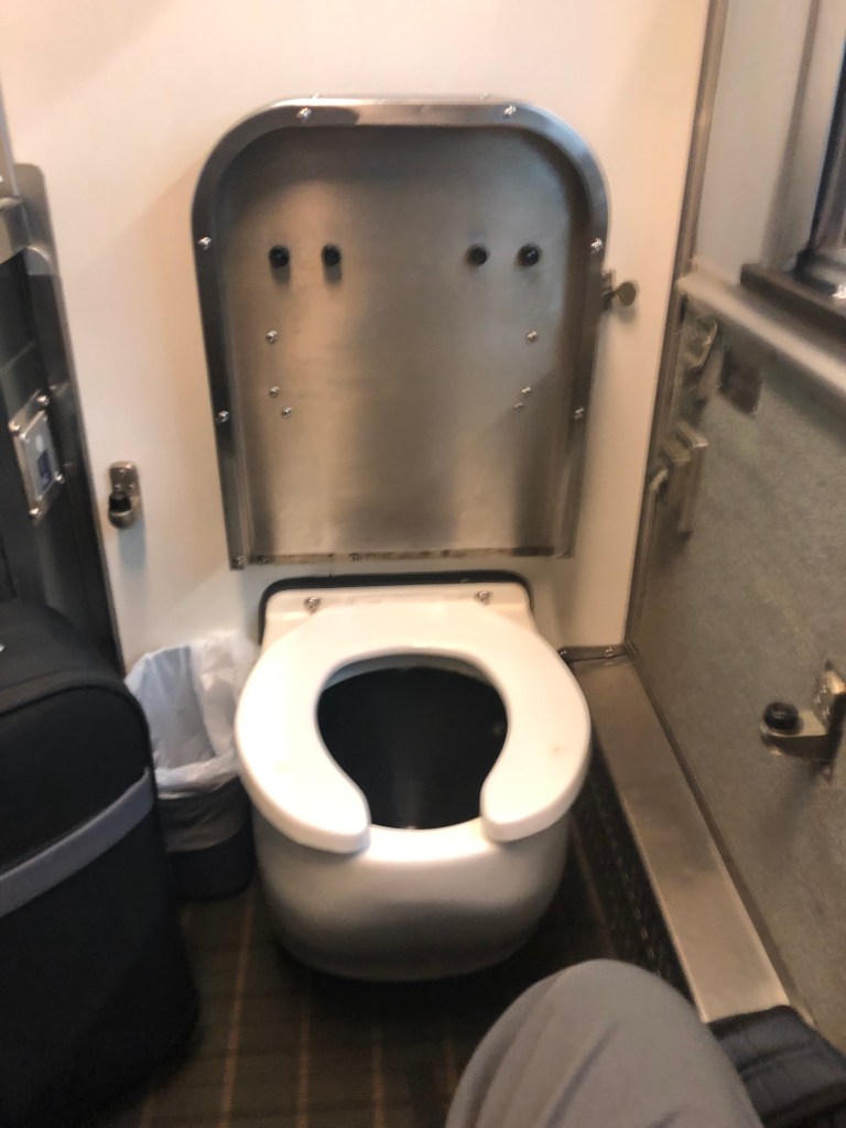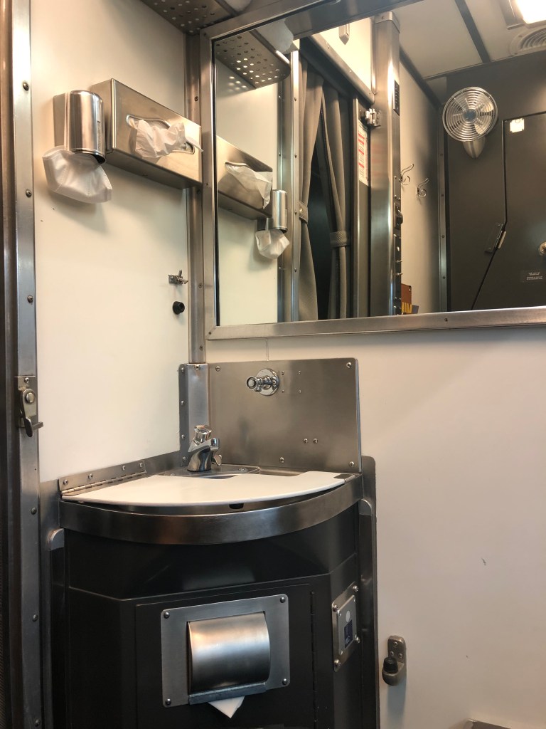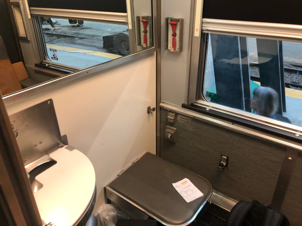 For my trip I had chosen a cabin for one. A Prestige cabin would have been nice but as they were all for two people the cost might have been prohibitive and they had all sold out when I came to book the trip anyway. Having been shown my cabin by car manager Gerard I was left to get acquainted with it. It was, well, bijou. In day mode there was a seat and a footrest. A sink was tucked up in the corner and that was about it. There was a solid sliding door and also heavy curtains which seemed like overkill but I’d soon find out why. But wait! What’s this? Lifting the lid of the footrest up revealed your own personal toilet. Erm, okay… For the night a bed is pulled down from the rear of the cabin and it takes up virtually all the space in the cabin. That included covering the toilet rendering it unusable at night unless you went to the faff of putting the bed up before you used it and back down again afterwards. I never used my personal loo at all, day or night, preferring the public ‘washroom’ at the end of the car. It seemed more hygienic to dispose of one’s body waste somewhere other than place you sat and slept. With the bed down there was hardly any floor space to stand. With the hard door open and the curtains closed you could expand slightly out into the corridor which helped when you were getting ready for bed. The hard door could be locked from the inside only. Leaving valuables in the cabin took a bit of a leap of faith at first but by the end of the trip iPhones were being left on charge unattended in open rooms, corridors and sometimes in the washroom shaver sockets. Apparently there have been no reports of things being stolen on The Canadian ever.