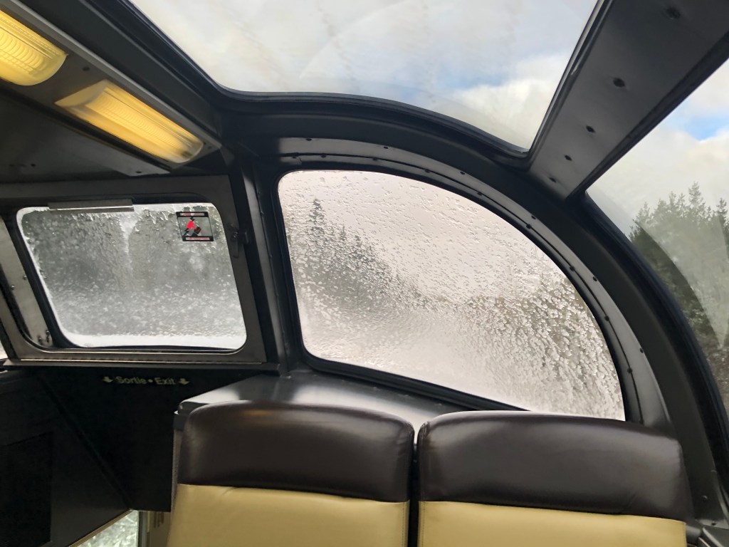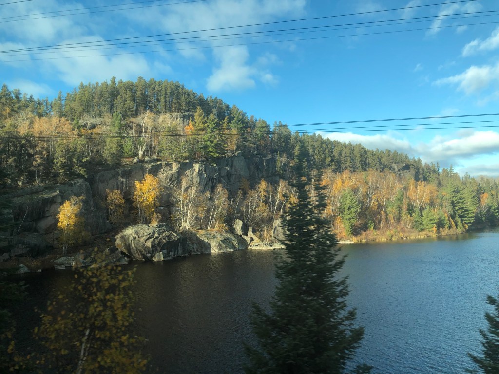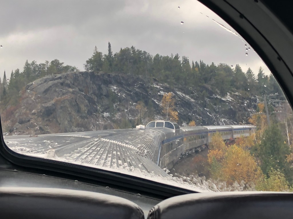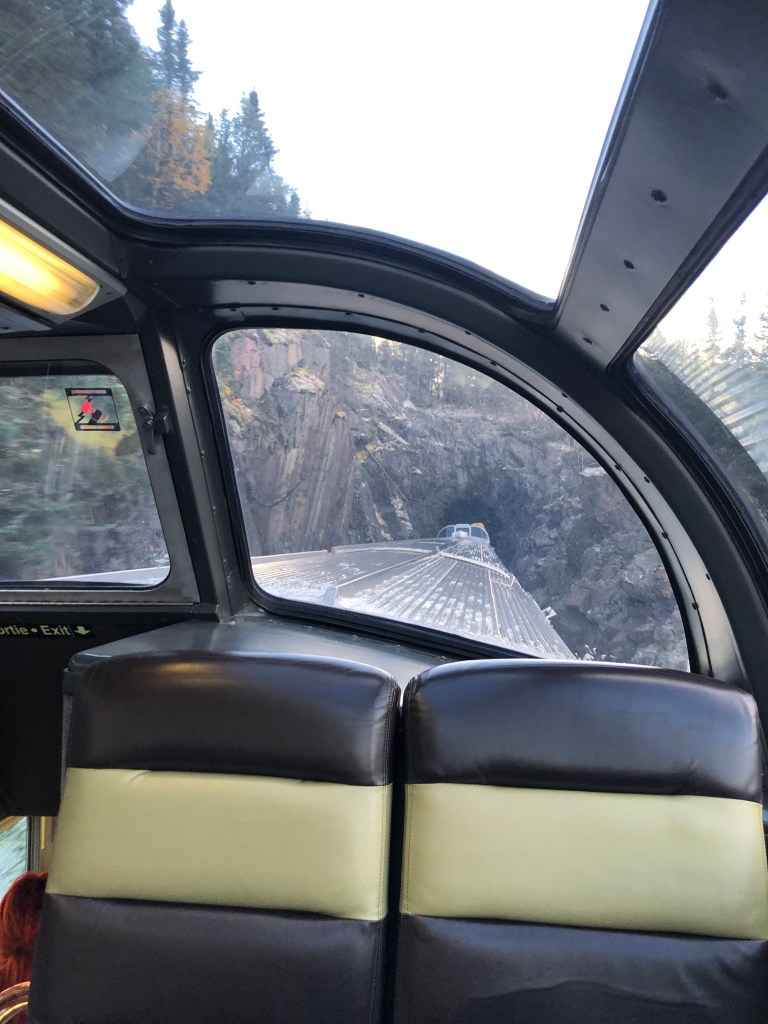 We pulled out of Union Station on schedule at 9:55am. For the first hour or so the train passes through largely unremarkable suburbs of Toronto. Some backing up and other jiggery-pokery was required to get us onto the correct track out of the city. It was an inauspicious start but gave me a chance to discover where everything was. I soon worked out that the Skyline car was the place I’d spend most of my conscious hours on board the train. The cabin was comfortable enough but as with The Ocean, it only gave access to one window. The Skyline had a couple of spacious areas to sit and, of course, the best part of the train, the panoramic dome. Twenty-four seats with views forward, backwards, left, right and even up thanks to its full length curved windows. In short, you could sit there completely surrounded by Canada. The dome could get busy at times but only rarely was full. The car had its own steward who would organise events and double as a barman. Tea and coffee were always available along with a few snacks. Soft and alcoholic drinks were available for purchase. Meals were arranged in two sittings, I was on the second today. Whilst the first sitting were being fed the Skyline car hostess gave those of us in the dome a talk about the history of the railway and more details of what to expect. There was no WiFi on the train. Contact with the outside world was restricted to Canada’s notoriously expensive cellphone data network which for long periods of the journey was unsurprisingly absent. By the time the second sitting was called to lunch we had left Toronto behind and passing through rural Ontario dotted with small settlements. As on The Ocean, lunch was a three course affair with a rather good cannelloni as the main. I wasn’t going to go hungry on this train either. In fact my emergency rations were barely touched by the time I reached Vancouver. We passed Parry Sound, a small town notable as being the birthplace of hockey legend Bobby Orr. Our first scheduled stop, where we could get off and stretch our legs, was in Caperol. Leaving there marked the beginning of the Canadian Shield. This is a vast area between the St Lawrence lowlands and the prairies. It is largely made up of boreal forest and ancient pre-Cambrian rock. Think lakes and trees then multiply that by several million and you’ll get the idea. Although we were leaving the vivd autumnal reds of Eastern Canada behind, the scenery was spectacular in a wild and unspoilt sort of way. Canada has many ‘Back of Beyonds’, the Canadian Shield is one of them that not many people know about. Eventually the light faded and the second sitting for dinner was called, steak and mash was the main. Unlike The Ocean, I was put on any table that happened to have a space which meant socialising with other people. As a shy, retiring type I felt a bit uneasy about this. I’m a silly sod. It was fine. We all had stories to tell including me. Eventually it was time for bed. The car steward Gerard had made up the bed as I ate. I hadn’t yet discovered the knack for getting changed without any floor to stand on but I managed it. It was time to sleep…