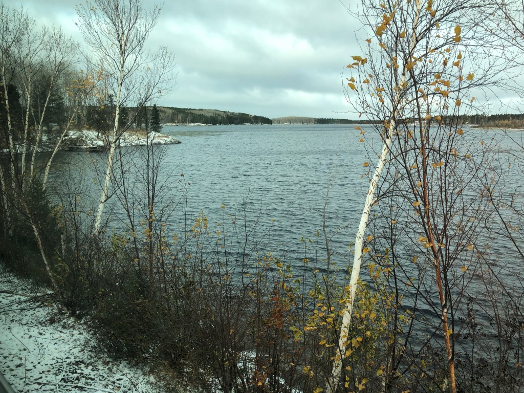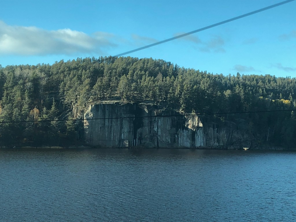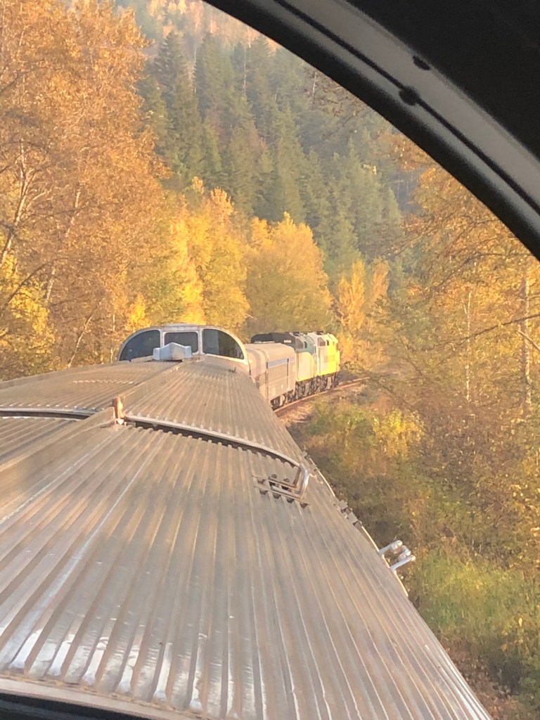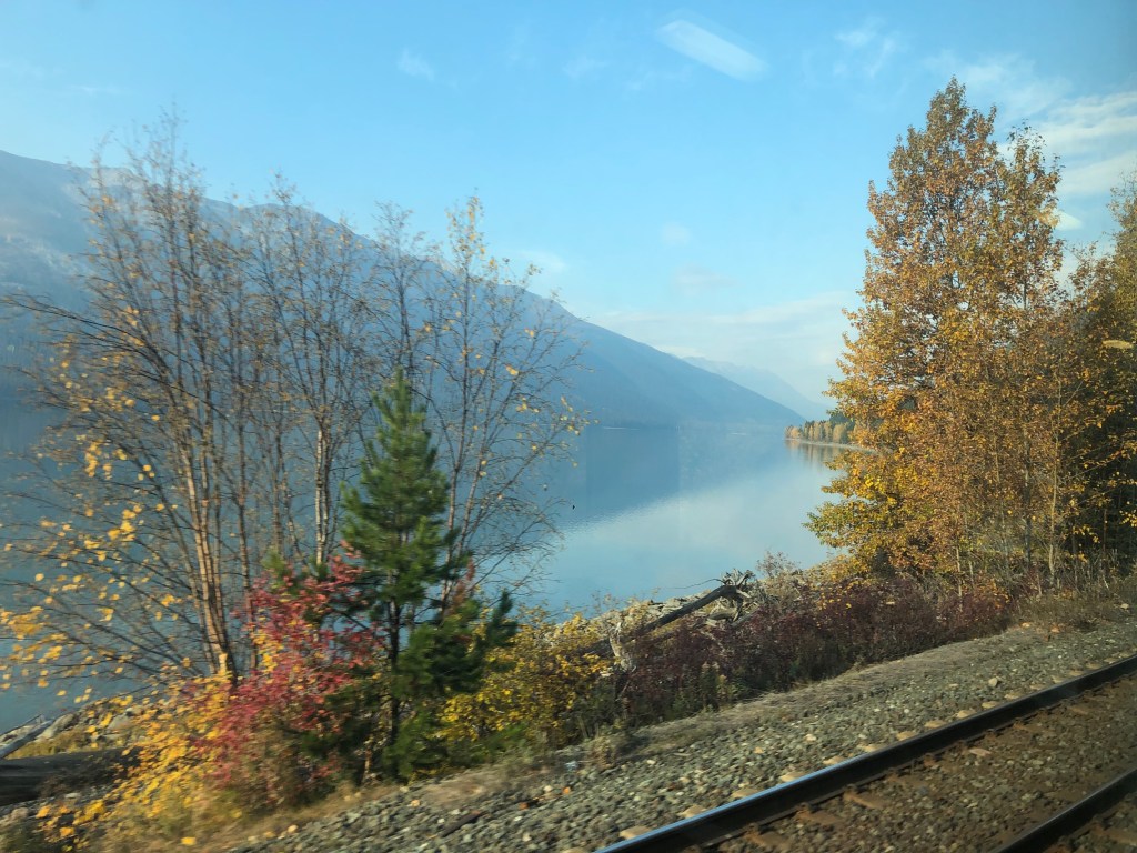 We pulled out of Union Station on schedule at 9:55am. For the first hour or so the train passes through largely unremarkable suburbs of Toronto. Some backing up and other jiggery-pokery was required to get us onto the correct track out of the city. It was an inauspicious start but gave me a chance to discover where everything was. I soon worked out that the Skyline car was the place I’d spend most of my conscious hours on board the train. The cabin was comfortable enough but as with The Ocean, it only gave access to one window. The Skyline had a couple of spacious areas to sit and, of course, the best part of the train, the panoramic dome. Twenty-four seats with views forward, backwards, left, right and even up thanks to its full length curved windows. In short, you could sit there completely surrounded by Canada. The dome could get busy at times but only rarely was full. The car had its own steward who would organise events and double as a barman. Tea and coffee were always available along with a few snacks. Soft and alcoholic drinks were available for purchase. Meals were arranged in two sittings, I was on the second today. Whilst the first sitting were being fed the Skyline car hostess gave those of us in the dome a talk about the history of the railway and more details of what to expect. There was no WiFi on the train. Contact with the outside world was restricted to Canada’s notoriously expensive cellphone data network which for long periods of the journey was unsurprisingly absent. By the time the second sitting was called to lunch we had left Toronto behind and passing through rural Ontario dotted with small settlements. As on The Ocean, lunch was a three course affair with a rather good cannelloni as the main. I wasn’t going to go hungry on this train either. In fact my emergency rations were barely touched by the time I reached Vancouver. We passed Parry Sound, a small town notable as being the birthplace of hockey legend Bobby Orr. Our first scheduled stop, where we could get off and stretch our legs, was in Caperol. Leaving there marked the beginning of the Canadian Shield. This is a vast area between the St Lawrence lowlands and the prairies. It is largely made up of boreal forest and ancient pre-Cambrian rock. Think lakes and trees then multiply that by several million and you’ll get the idea. Although we were leaving the vivd autumnal reds of Eastern Canada behind, the scenery was spectacular in a wild and unspoilt sort of way. Canada has many ‘Back of Beyonds’, the Canadian Shield is one of them that not many people know about. Eventually the light faded and the second sitting for dinner was called, steak and mash was the main. Unlike The Ocean, I was put on any table that happened to have a space which meant socialising with other people. As a shy, retiring type I felt a bit uneasy about this. I’m a silly sod. It was fine. We all had stories to tell including me. Eventually it was time for bed. The car steward Gerard had made up the bed as I ate. I hadn’t yet discovered the knack for getting changed without any floor to stand on but I managed it. It was time to sleep…