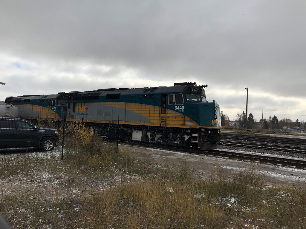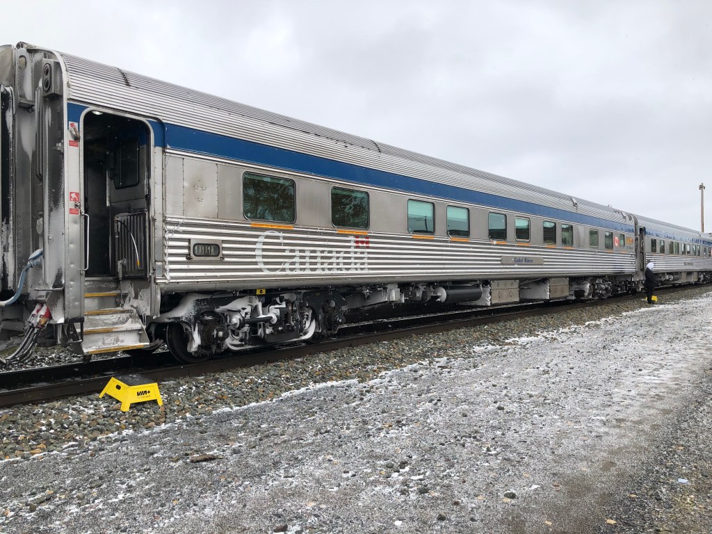 A far more leisurely stroll than the previous evening’s rush to Toronto Union Station, which is a very impressive building, meant I pitched up an hour before departure. As in Halifax there is a Business Class lounge where sleeper passengers could check in. It seemed very busy. Having done the necessary paperwork I went and deposited my suitcase with the baggage people and hoped I would see it again in Vancouver. Back in the lounge I wondered just how busy the train would be as the lounge itself was barely able to cope. I needn’t have worried. Once boarding was called, I caught a first glimpse of the train. It was huge. Twenty-two Stainless Steel cars, built in the 1950s, hauled by two diesel locomotives. The Canadian has four passenger classes. At the front of the train is the baggage car and two cars for the Economy (seating) passengers. Some of those seating passengers would do the entire journey to Vancouver including one woman with a large dog called Ellie. They are braver folk than me. Towards the rear were two Prestige sleeping cars each containing six luxury cabins with en-suite facilities. Behind that was the Park Car, a very well appointed lounge for the Prestige passengers with its own upstairs dome and a unique bullet shaped rear providing panoramic views of where you’d just been. Unfortunately Transport Canada, the regulator for all things public transport, had decided that this was unsafe and this particular journey was the first that required an extra empty car behind the Park car to serve as a buffer thereby spoiling the view. Between the economy and prestige sections lay the bulk of the cars which housed the sleeper passengers. There were approximately ten sleeping cars. Accommodation in each consisted of six double cabins, four singles, one of which was reserved for the car manager, and six semi-private bunk berths with night time privacy provided by heavy curtains. Passengers in these cars had access to two restaurant cars and two Skyline cars. The Skyline cars had a lounge area and a panorama dome upstairs. A third Skyline car was provided for the Economy passengers. There was another car for the train staff and I’ve possibly missed a few more so suffice it to say it was a long train. Almost half a mile long, yet still dwarfed by the endless freight trains we would pass.