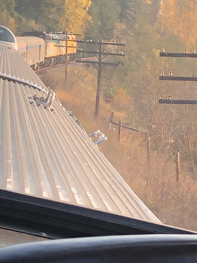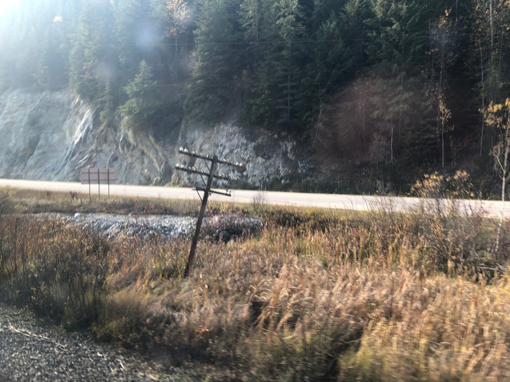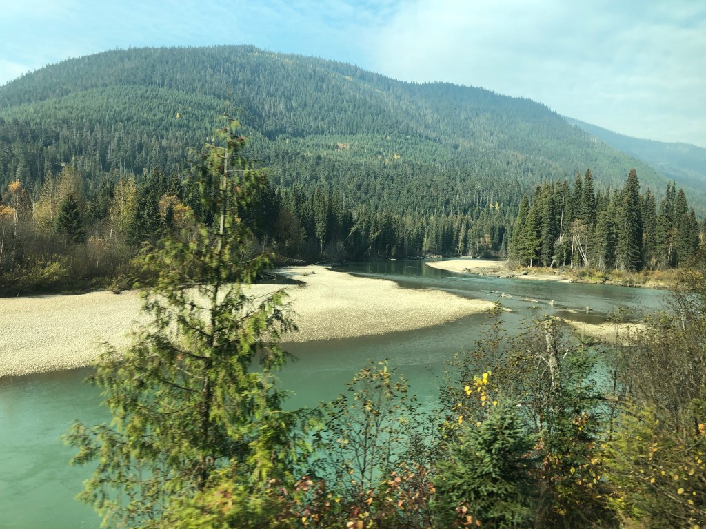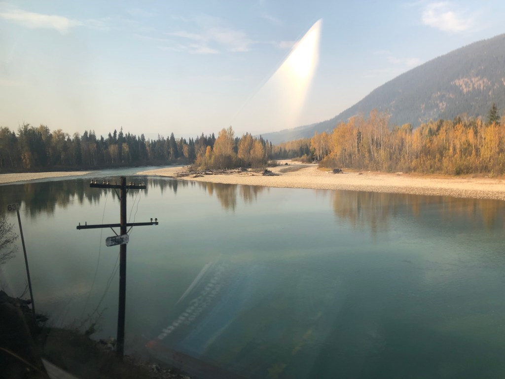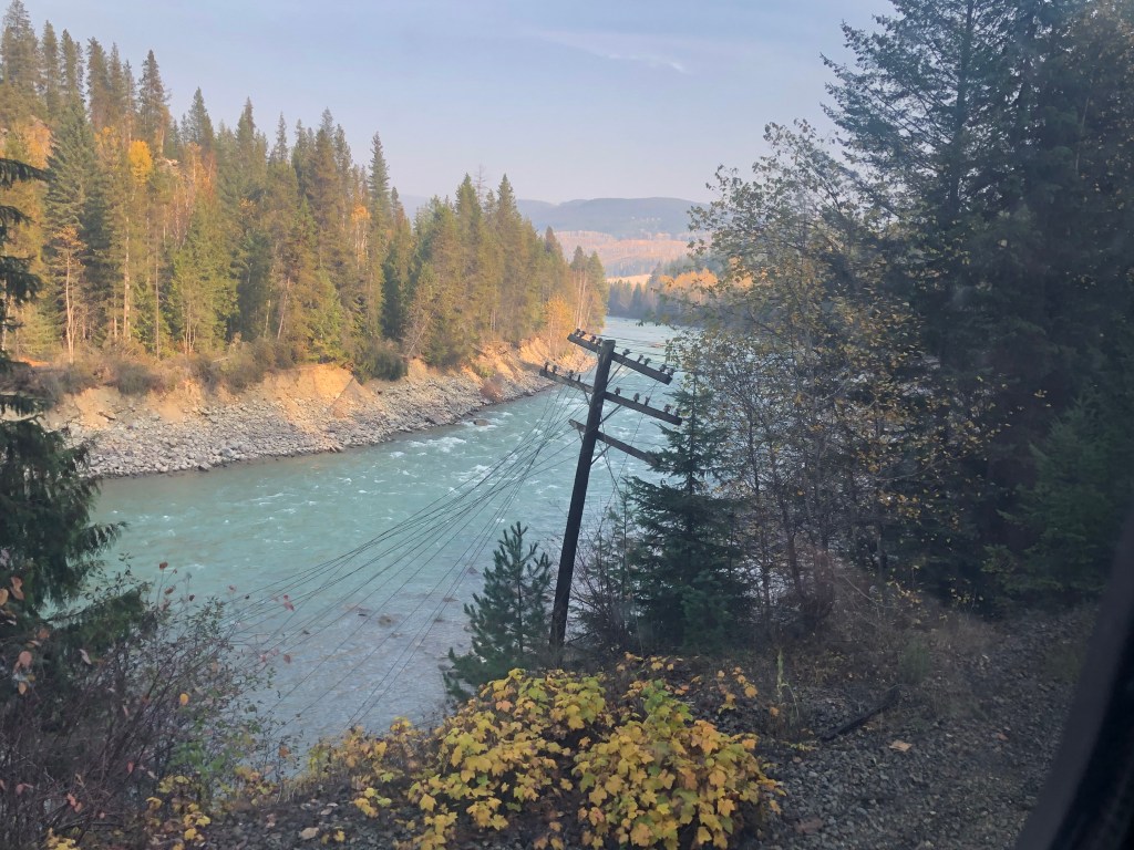 It was a patchy night’s sleep and I awoke at 5-30am as the train ground to a halt in the town of Jasper having arrived an hour ahead of schedule. There was a long stop here which would have been really nice if it had been scheduled later in the day when the town opened up. There was one enterprising gift shop that opened up along with a coffee shop but most of the town would remain in their slumbers until the train left. It’s a shame as it looked like a nice place. However, it was Rockies day and although we’d passed through quite a lot of them during the night, there was still plenty of Rocky action to come. The dome promised to extra busy today so I ignored the normal big breakfast and grabbed a few buffet items, claiming my seat early. It was a long wait until we set off. By then the place was understandably packed. The sun had risen over the mountains whilst we were stopped at Jasper giving us a preview of what was to come. It was, of course, fantastic. Mountains, trees, rivers, waterfalls, lakes and the regular sight of passing shipping containers heading eastwards on massive freight trains. Strangely enough, those didn’t spoil the view. What did spoil the view a bit was all the people in the dome car. It is perfectly understandable that they wanted to get the perfect photo but didn’t they know the I wanted to get the perfect photo too? After a while I decamped downstairs to the lounge area which was almost empty. You don’t get the stunning panoramic views that you get in the dome but at least there was no one jumping in front of me when another beautiful mountain gently sauntered past the window. After an early lunch I returned to a less busy dome car and spent most of the afternoon there. Emerging from the Rockies, we were told to put our watches back an hour as we entered the Pacific time zone. Finally I was in the same time zone as Rebecca in Victoria. The scenery remained spectacular, just not quite as spectacular as the Rockies. I became quite obsessed with the telegraph poles. Long since redundant, these poles, many with the wires still strung between them, once lined the entire track. Many of them remain in the Canadian Shield but they had all more or less gone from the Prairies. I suspect they were a valuable source of firewood for the harsh winters they have there. I was glad to see them back as we passed through the Rockies. Some have collapsed, some wires have snapped but many remain upright supporting cables that transmitted their last message many years ago. Eventually we started seeing signs of civilisation with some cultivated fields and isolated villages. This gave way to bigger settlements as we entered the furthest reaches of the town of Kamloops. As usual it took a lot of waiting and backing up to get into Kamloops. The town is a major railhead and the station part of the shunting yards so we were under strict instructions to remain on the platform. This was the last stop before journey’s end in Vancouver. There was to be just one last night onboard The Canadian.