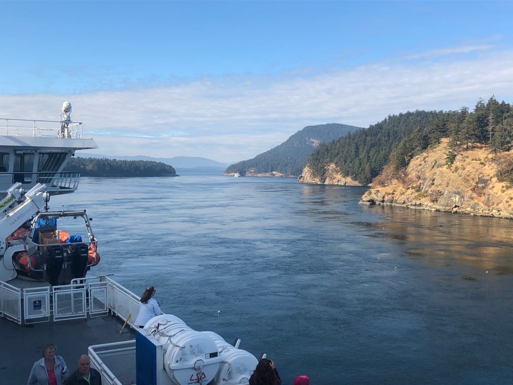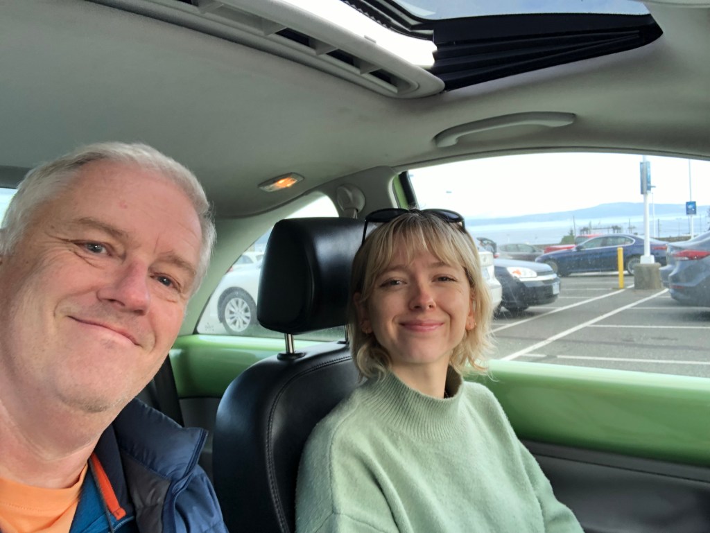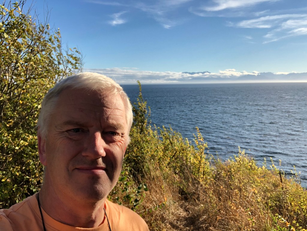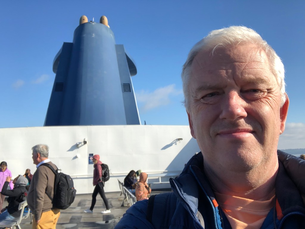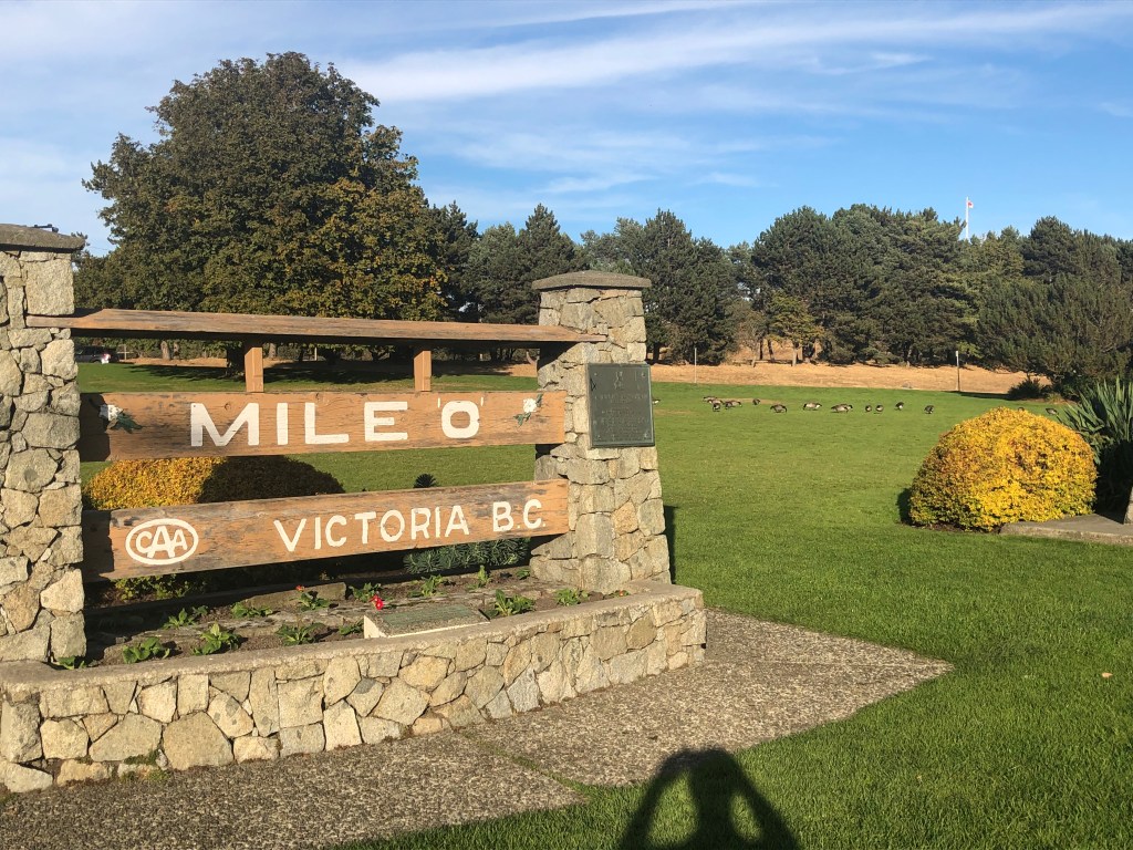 I slept reasonably well. The route from Kamloops to Vancouver has, apparently some spectacular bits to it as it follows the Fraser River for much of the way. You don’t get to see that at night of course but I guess it’s nice to know it’s there. I woke at 6am just as the train pulled into Vancouver’s Pacific Central Station. It was two hours early! I suspect the schedule has the inevitable delays built into it. We had to disembark the train by 8am so there was time to pack and for the usual morning activities concerning ablutions and breakfast. Then, at 7-45am on October 20th, my 61st birthday, I stepped down from the train and headed up the platform to the main concourse. No bells and whistles, no ceremony, that was it. The rail trip was over. It wasn’t quite the end of the journey though. Collecting my suitcase, I walked a mile or so to one of Vancouver’s Transit stations, went on the Skytrain for a few stops, transferred onto a bus which took me to the BC Ferries terminal at Tsawwassen and bought a foot passenger ticket to Swartz Bay. The Spirit of British Columbia was the ferry charged with the task of navigating through the Gulf Islands to Vancouver Island and once there, Rebecca was waiting for me with her 18 year old Volkswagen Beetle, Frog. We stopped in the town of Sidney for lunch and that birthday beer before heading to my hotel in downtown Victoria. It was just a short walk from there to Milepost Zero, the start (or end) of the Trans Canada Highway. Although the other Milepost Zero is in St Johns, Newfoundland rather than my starting point in Halifax, and I’d crossed the country by train, not car, it seemed a fitting place to take an end of trip selfie there with the Strait of Juan da Fuca, part of the Pacific Ocean in the background. Atlantic to the Pacific by surface transport, TICK.