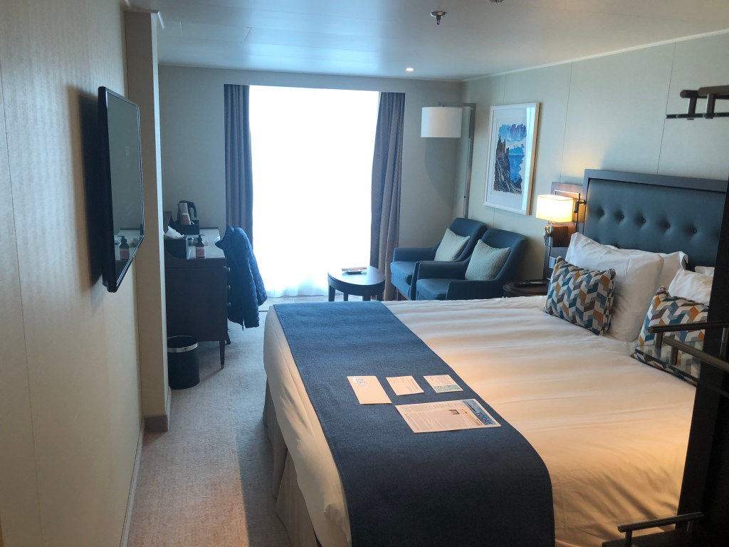 Another advantage of booking a Saga cruise is that they all go from the UK. That’s a bonus to most people but not necessarily an avgeek like me who rather enjoys a trip on a plane. Not having the hassle of airports is a good thing for many people, especially those who are of an age to take a Saga holiday. Not only that, Saga send someone to pick you up and drive you to the port. This service is free for anyone within 250 miles (300 miles from next year) of the port of departure. For this cruise it was Portsmouth which meant I, or anyone else residing in Scotland didn’t qualify for the free chauffeur service although Saga do supposedly offer cheap transfer services to those living outside the zone. As it happens, my mum’s house is 247 miles from Portsmouth so we booked the pick up from there. The driver duly arrived at the appointed time in a rather nice Mercedes people mover. There was one other passenger already in the vehicle and we set off to Portsmouth a four and a half hour drive away. For some reason I hadn’t really been looking forward to this but it was fine, very pleasant in fact. At the port the baggage, including mum’s wheelchair, was taken directly from the car before we were dropped off at the check-in. We had pre-booked assistance but needn’t have bothered as there was very little walking for mum to do. A bus took us from the check-in building to the gangplank where we boarded and were shown to our rooms. We’d each got a Superior Single cabin on the port aft of Deck 12. Look at me with the nautical terminology. I have been on a few cruises before. On none of those cruises have I stayed in a cabin as good as this one. All cabins on the Spirit of Discovery and its sister ship Spirit of Adventure have a balcony. That was a first for me and there’s no going back to inside cabins or even outside cabins with a non-opening porthole as I’d experienced a few years ago. Despite being a single cabin, it had a bed plenty big enough for two should any of the old solo travellers score on the cruise (stop being ageist and disapproving). There was plenty of living space and a small but well thought out bathroom, good storage and all the other little bits and pieces that you’d get in a good quality hotel room. Our cabin steward Jennifer introduced herself and promised not to fold the towels into animal shapes like you get with other cruise lines. Actually she didn’t promise, she just didn’t do it as presumably the Saga clientele is generally too old to be impressed by a towel folded into the shape of an elephant being left on the bed. I must be getting old too as wasn’t disappointed. I thought the room/cabin/stateroom, call it what you will, was fantastic.