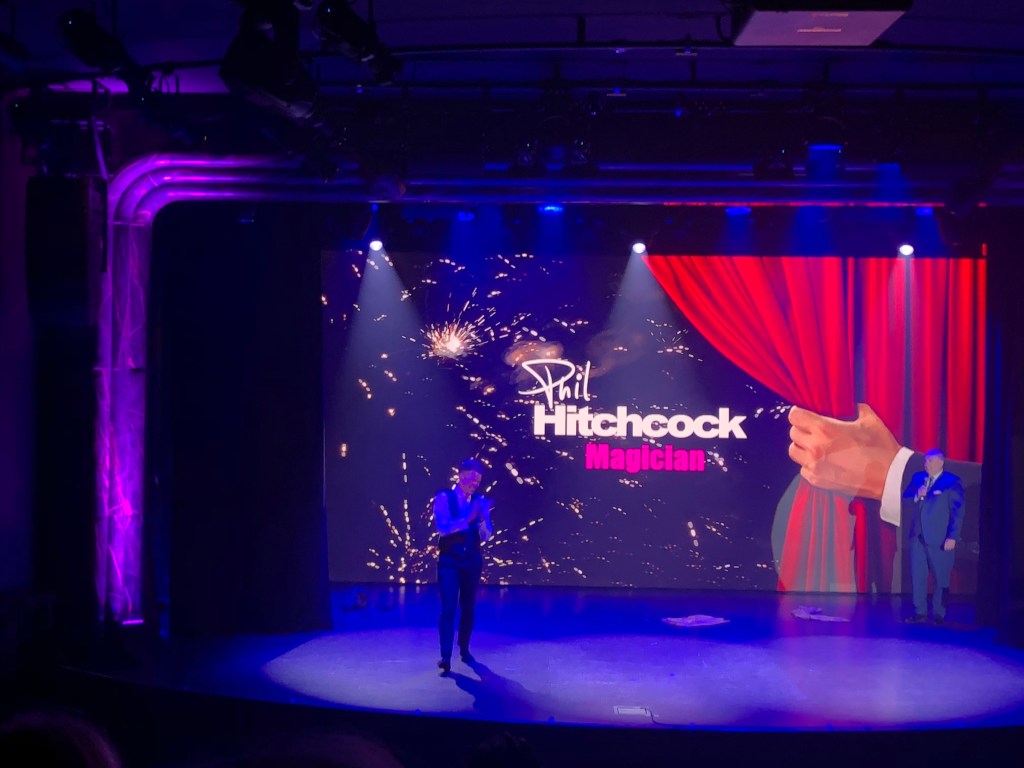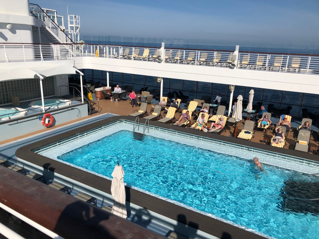 A word about the crew. All the cabin stewards, waiting staff, bartenders and just about every other job that had day to day contact with the passengers, were Filipino. For some reason all cruise lines, not just Saga, recruit from the Philippines and have no difficulty in filling the available vacancies. Some people can struggle with this: wealthy westerners being served by people from relatively poor countries. However, the Filipinos seem happy in their work and genuinely friendly towards the passengers. Yes, they could just be acting and secretly despise us but I very much doubt it. As mentioned, there is no shortage of people applying for all the various posts which suggests it is seen as a good employment option. Guilt avoided, let’s look at the ship they call home for much of the year. The Spirit of Discovery was built in 2019, the first of a pair of new ‘small’ cruise ships built exclusively for Saga, Spirit of Adventure being the other which took to the seas the following year just in time for the pandemic. I say ‘small’ but that is a relative term. Gross tonnage, which is actually a measure of internal volume rather than weight, is 58,250. By contrast, the world’s largest cruise ship, Wonder of the Seas, has a gross tonnage of 236,857 so Discovery is a tiddler by comparison. The difference is it caters for 987 passengers as opposed to Wonder’s nearly 7000. Wonder is indeed massive but do the maths and you can see they need to fit seven times as many passenger in four times the volume. Discovery has a higher crew to passenger ratio too, more than one to two as opposed to one to three in the big ship. The big cruise lines are all going down the road of huge ships but there is still a market for smaller, more intimate vessels and as Saga’s clientele is hardly likely to need the water slides, climbing walls and go kart tracks on the mega liners, it seemed a wise choice to commission two ships at the smaller end of the size range.