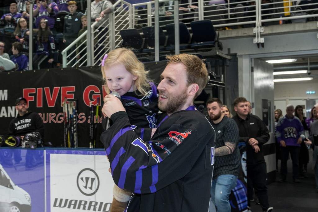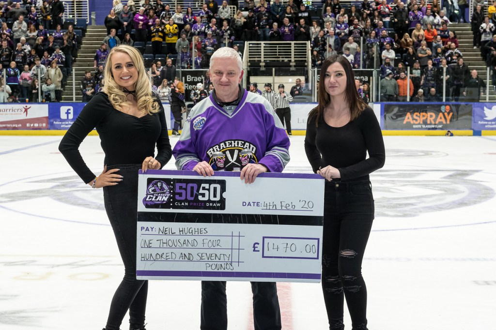 “Not sure”, they said. Eventually we sort of agreed that the number announced was the same as the third ticket in my pile and that I was indeed the winner of what at the time was a mystery prize total. After a celebratory fist pump with the ladies I headed out of the arena to the concourse to claim the prize. I must add here that in a normal game this is one thing that puts me off the 50/50 draw. If I ever managed to win it I may well receive a significant amount of cash but I’d miss what could be an exciting end to the game. This game, however, was not a serious affair as witnessed by the final score, 19-17 to the ex-Clansmen, so walking out before its conclusion was no great hardship. At the desk in the foyer I stated my claim. The two volunteer ladies who run the draw at every Clan game were still tallying up the takings. Tracy, who works for the Clan and I know of old, was also on hand and wrote the winning amount on a big presentation cheque that has been doing the job for many seasons. The total takings for the 50/50 draw was £2,940. The prize money, as written on the cheque, was £1,470. That is not the end of it of course. There is an official presentation at the end of the game. Before I was led down to the ice, however, I was handed an envelope. It took me a bit by surprise. It contained my winnings in £10 and £20 notes. I hadn’t really given any thought to how I’d receive the money. Armed with an envelope of banknotes and a large imitation cheque I headed into the bowels of the arena. Almost as soon as the game ended I was gesticulated onto the ice where there was rubber matting laid out to reduce the chance of slipping. Kevin the announcer, who I also know of old, informed the fans that the winner of the 50/50 was Neil Hughes and I marched out with the big cheque to monumental applause. Well, maybe a ripple of polite applause. And not an insignificant amount of apathy. I got my photo taken with the cheque and a couple of pretty girls and wandered back to the area behind the players’ benches. I hung around to watch further presentations and the speech by Matt Haywood and that was that. The cheque was left ready for the name of next Saturday’s winner to take the place of mine, I said goodbye to Tracy and headed out into the departing crowds. I did nip back to the mech desk though and bought a tee shirt. I thought it was the least I could do.