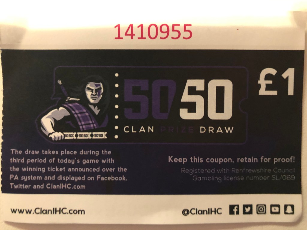 I digress. I watch my hockey in Glasgow where the Glasgow, formerly Braehead, Clan have been playing for the past ten seasons. They have had a 50/50 draw if not from their inception, for as long as I can remember. Prizes were initially a couple of hundred pounds but as the club became more popular and the new fanbase caught on to the tradition the prize totals crept up. For a number of seasons I bought a ticket or maybe two. By the 2015-16 season I was generally buying five a game. I must add here that I’m not a gambler. I’ve bet on a horse just a couple of times in my life and I’m £10 worse off than I would have been had I not stepped inside a betting shop. That still irks. Gambling has zero appeal to me. Entering a lottery which aims to raise money for good causes is different, however. It is a form of charity and yes, there is a small chance you might win something worthwhile but you justify it knowing that the money you’ve spent is going to be put to good use. Such was my reasoning for buying 50/50 tickets at the hockey, even if the real beneficiary was not a charity but a commercially run sports club that still has no trophies to its name. I never won of course. I never really expected to. I did check the number whenever the winning ticket was announced midway through the third period but the closest I got was when that number was just two away from mine. Had I only been one person ahead in the queue to buy the ticket it would have been me. Hey-ho. Eventually I stopped buying the 50/50 tickets. I think we were having a particularly bad season and felt less inclined to part with any more money than was strictly speaking necessary.