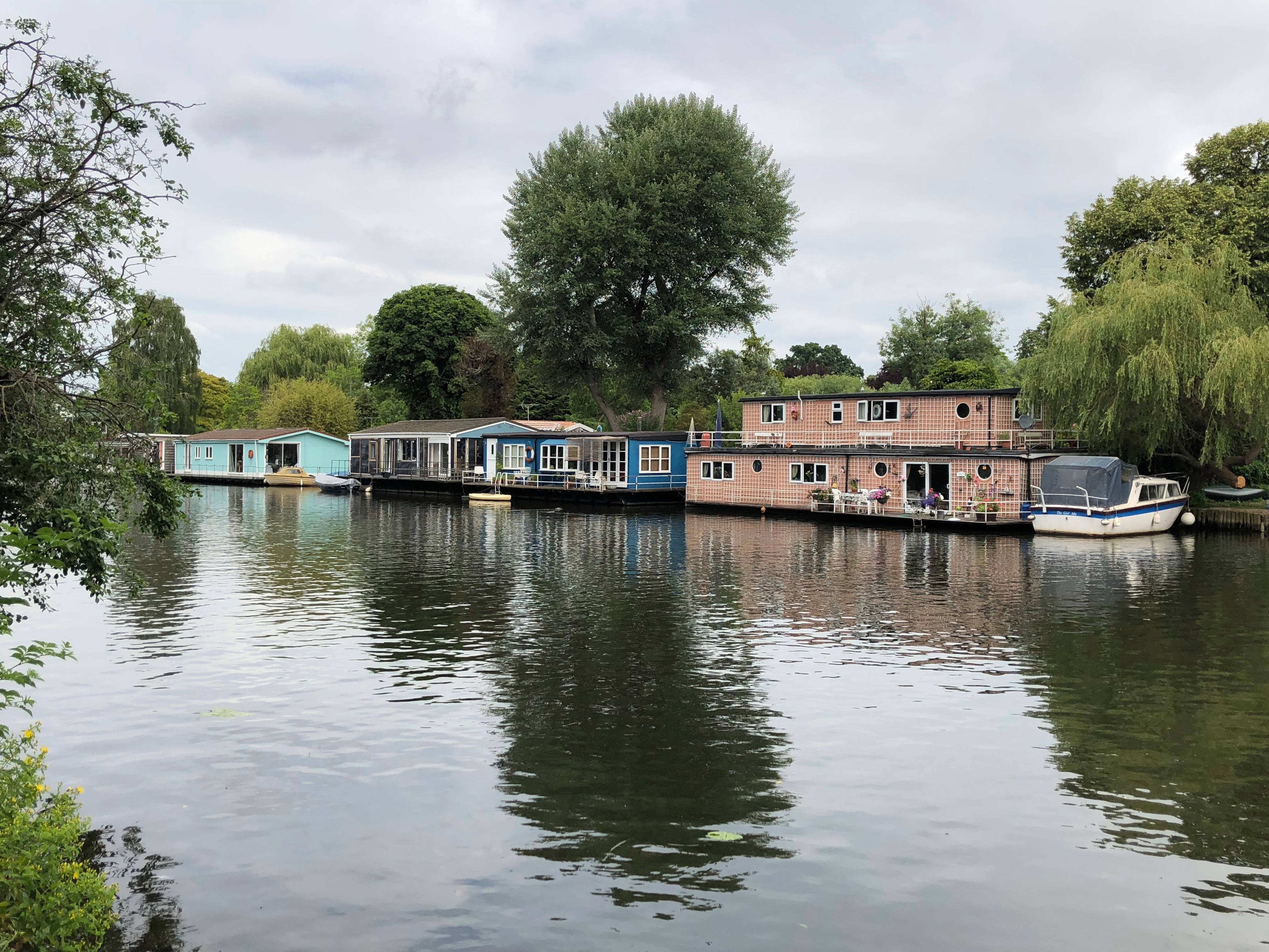 River Thames, houses, swans, geese, boats. The blue one was our home for three nights.